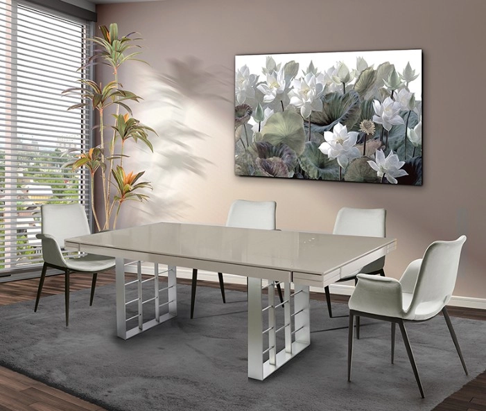 Mesa de jantar com acabamento em cinza-claro, lacado brilhante, com ranhuras decorativas e detalhes cromados.