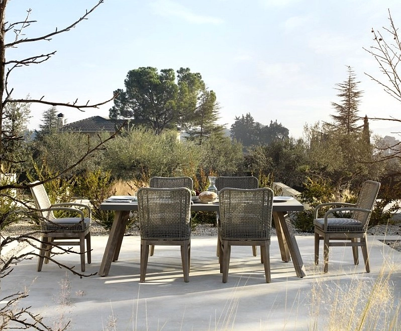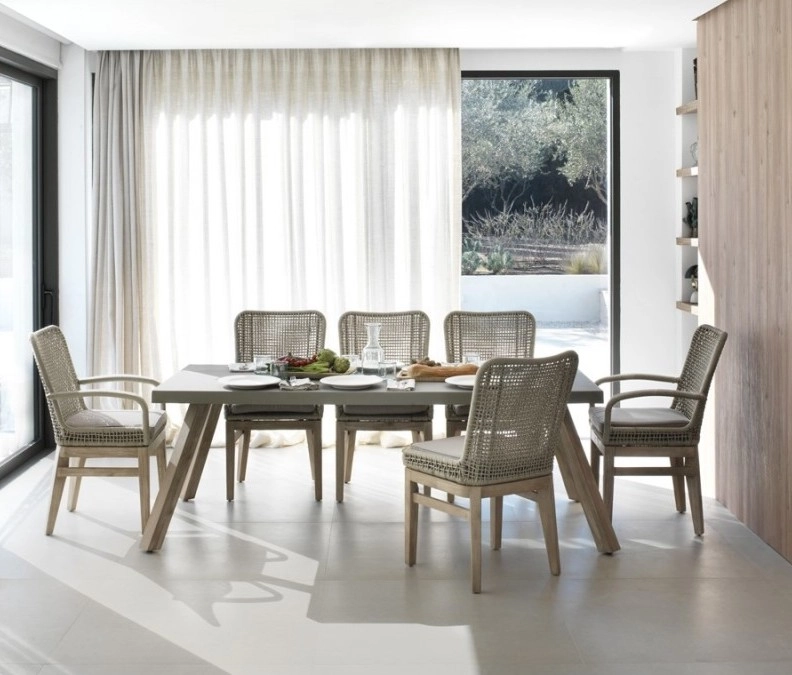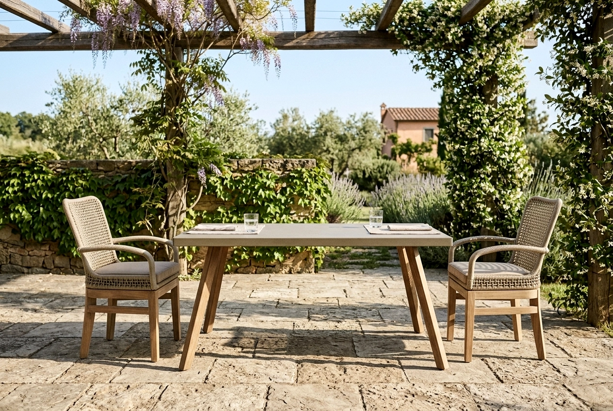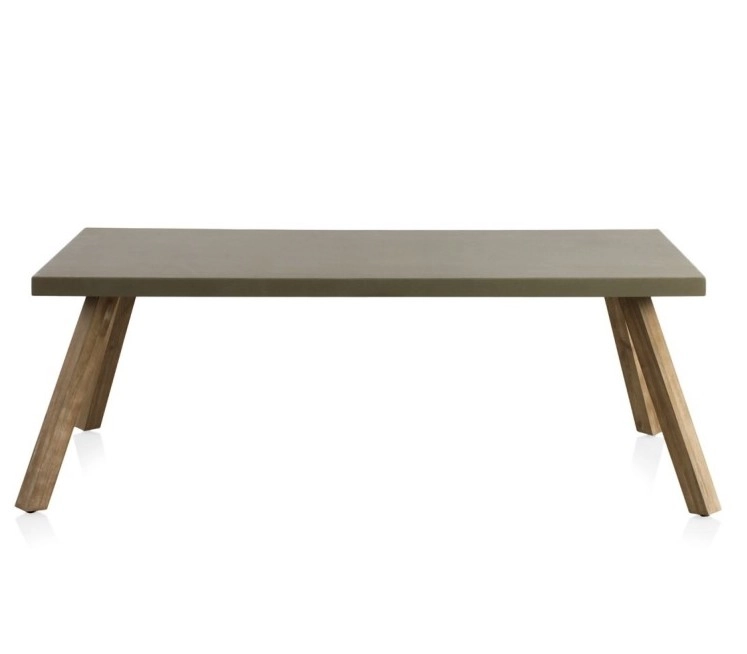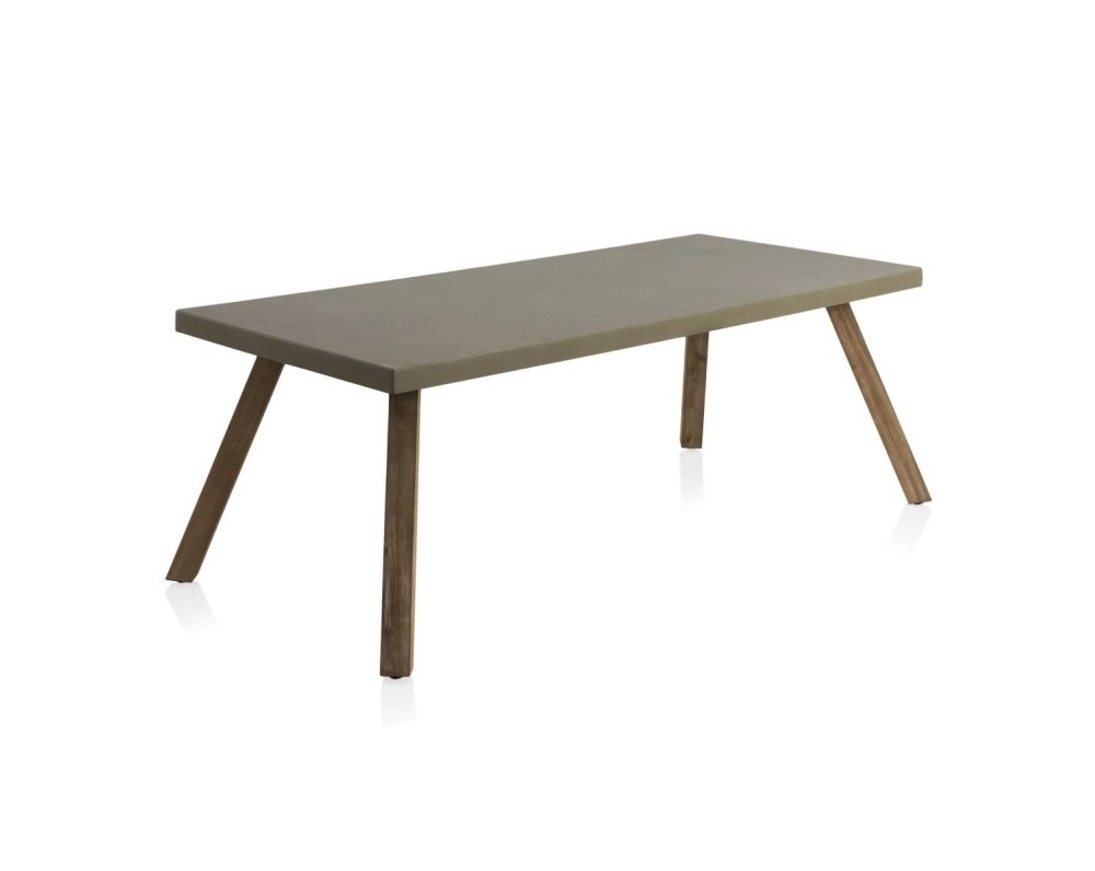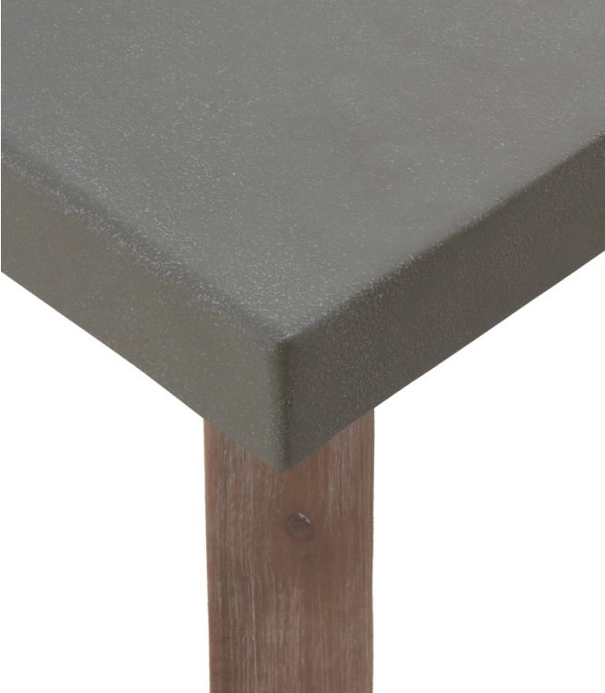 Mesa em madeira de acácia com acabamento ligeiramente patinado.