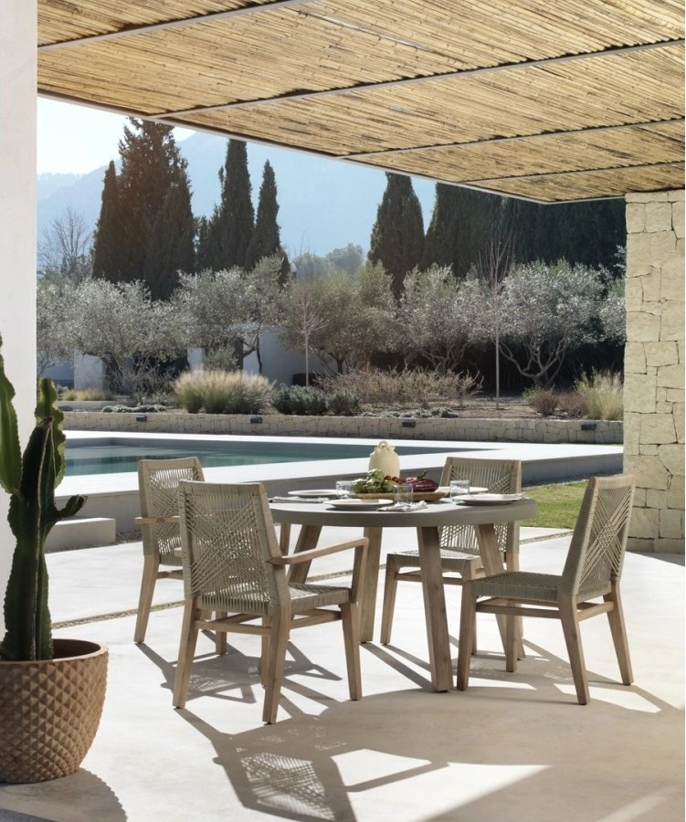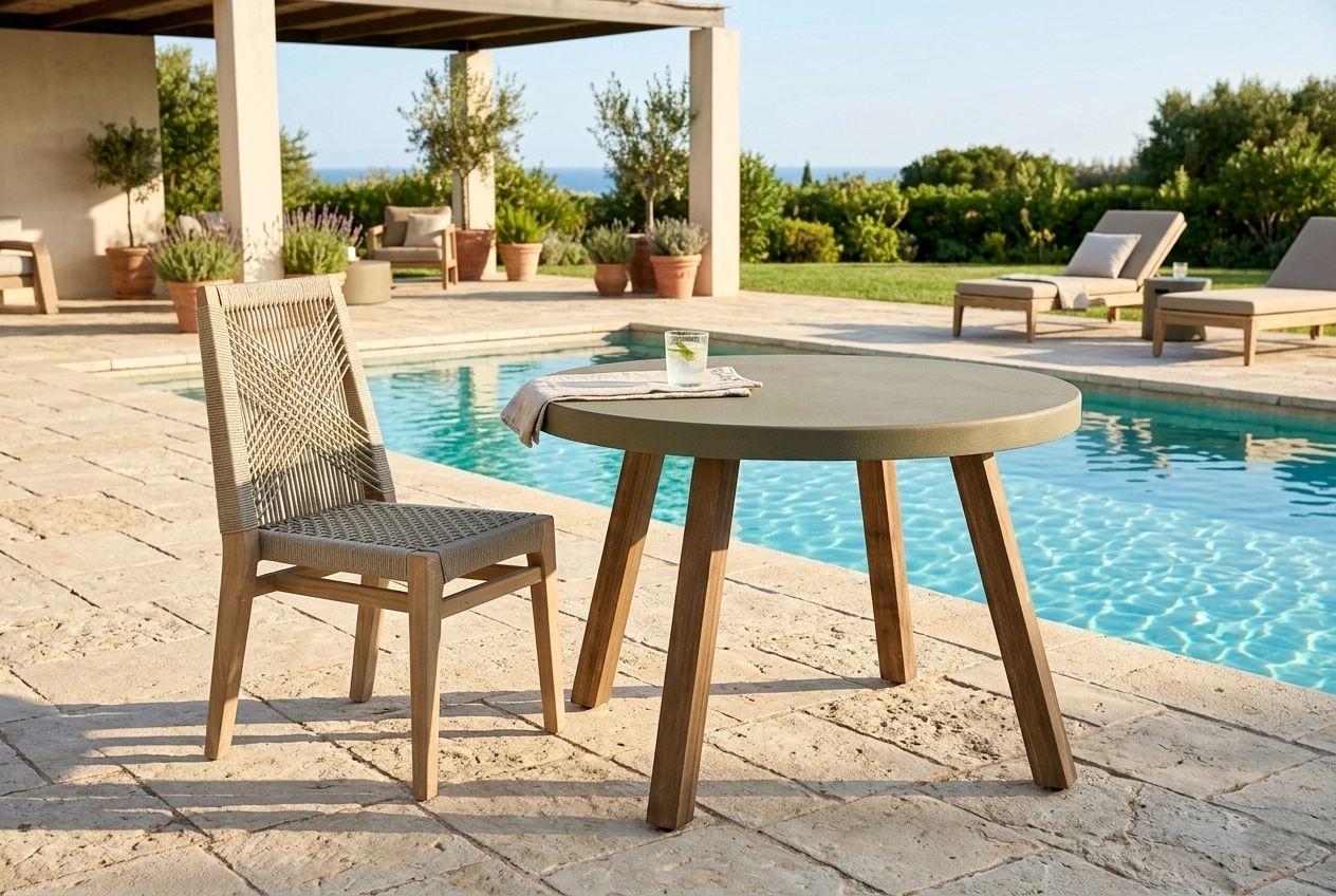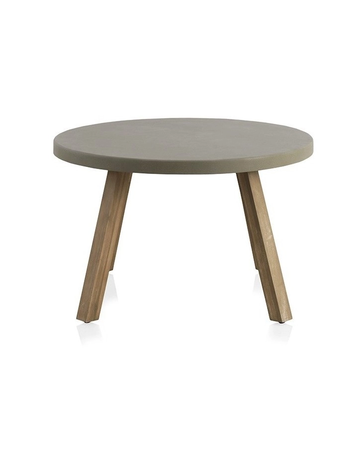 Mesa em madeira de acácia com acabamento ligeiramente patinado.