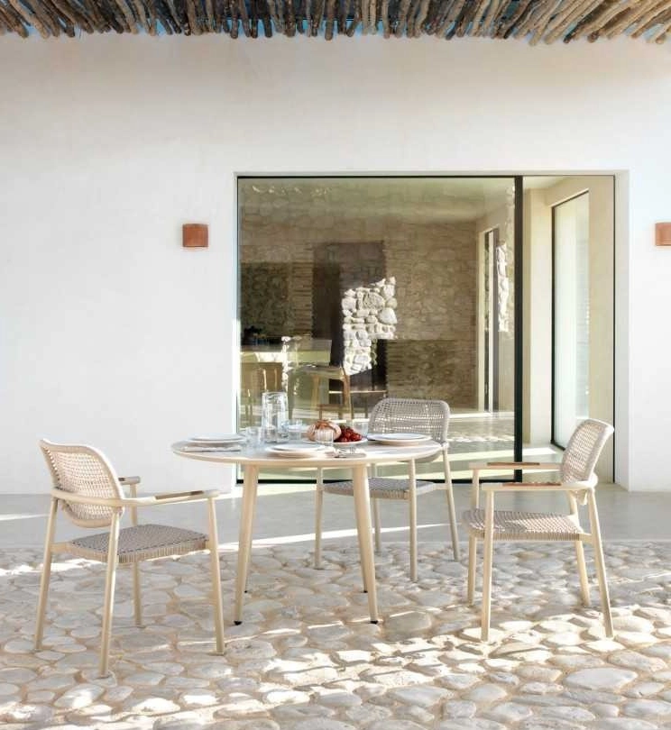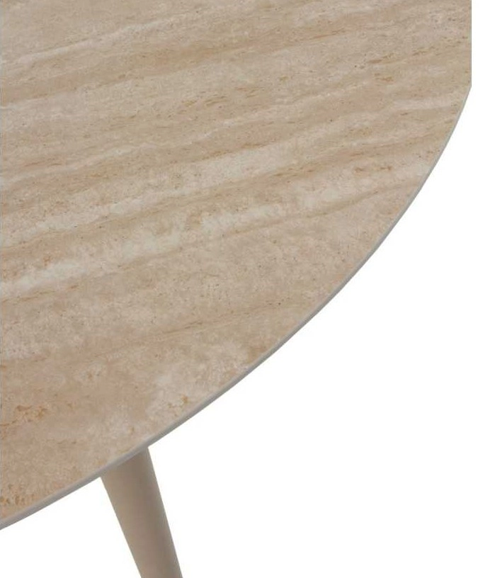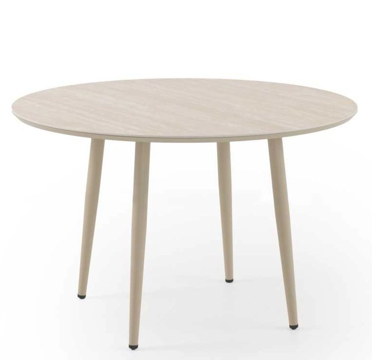 Mesa redonda de alumínio cor areia com tampo em cerâmica travertino de 6mm espessura.