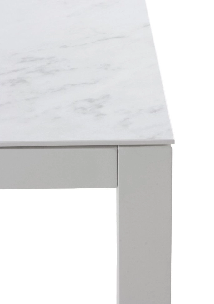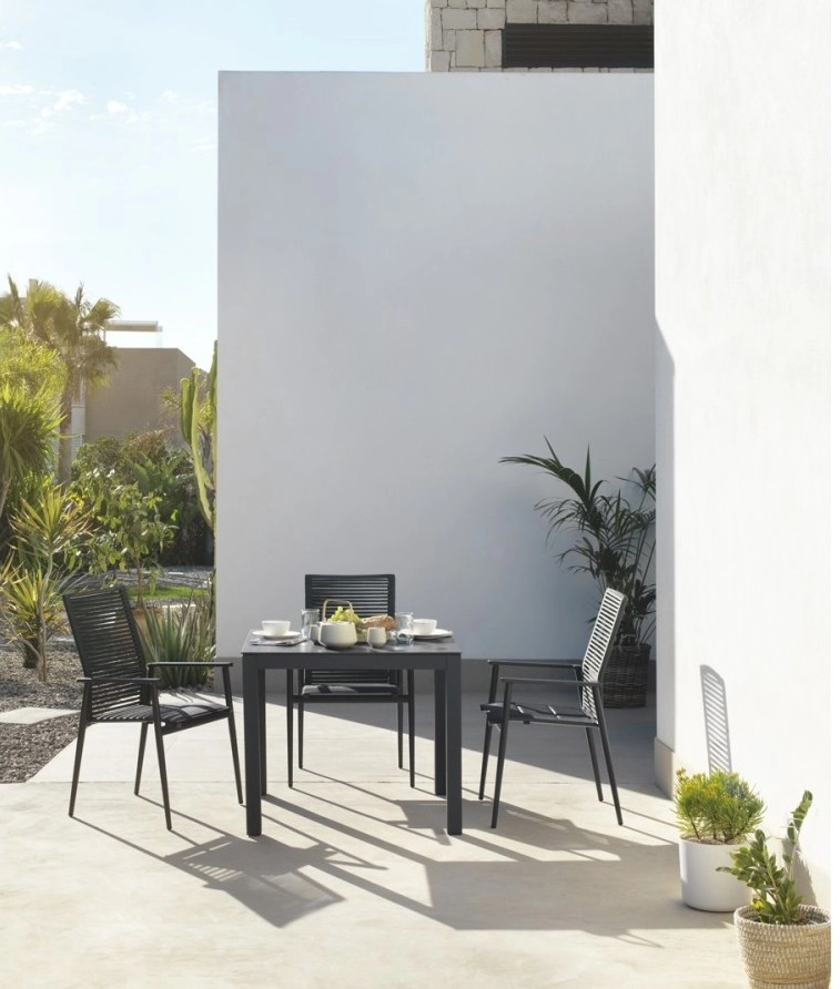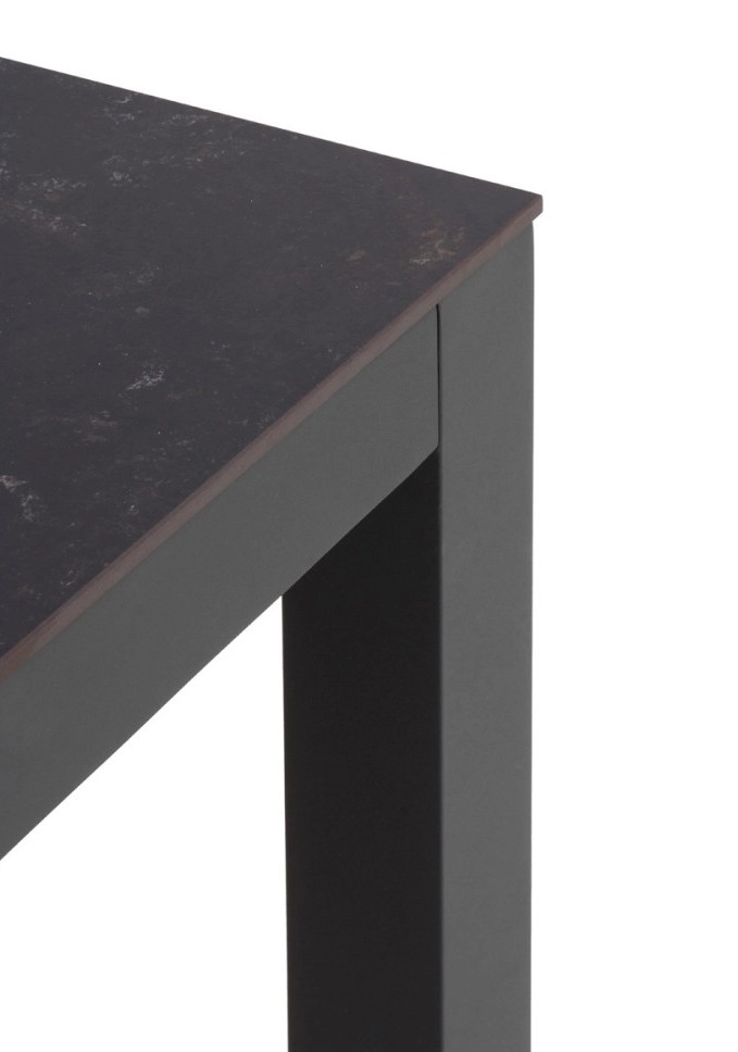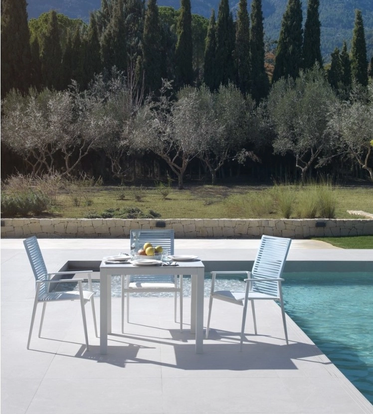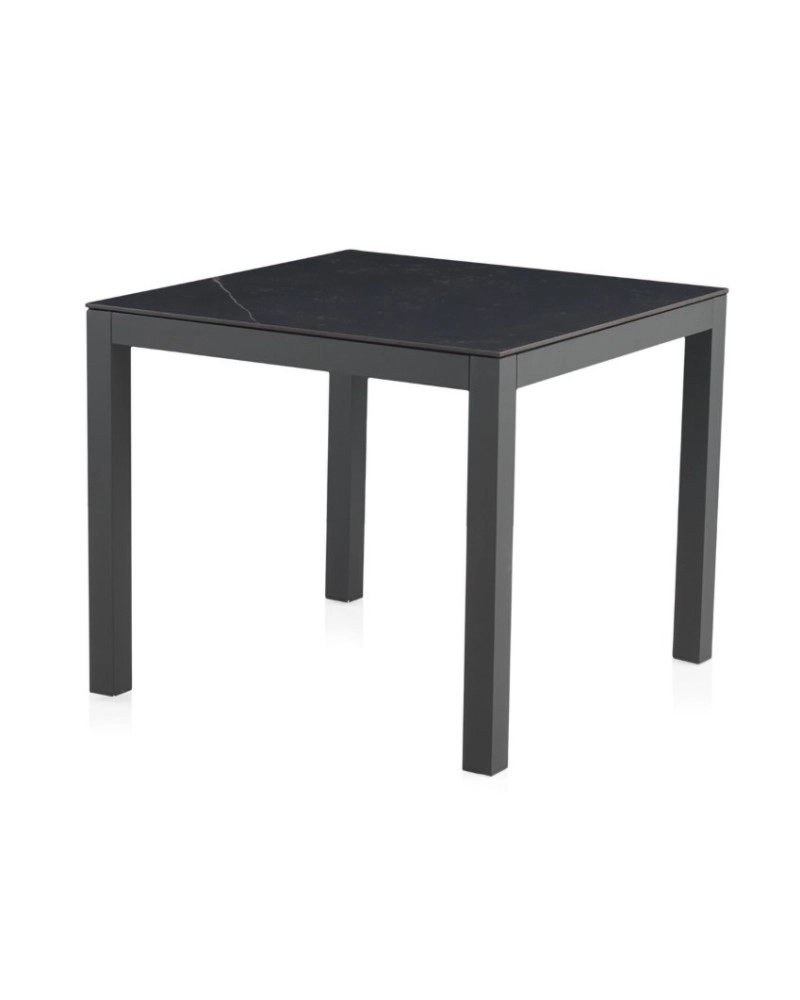Mesa quadrada em alumínio cor cinzento carvão ou branco, com tampo em cerâmica Dekton by Cosentino.