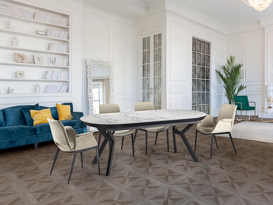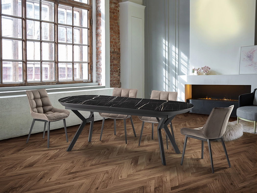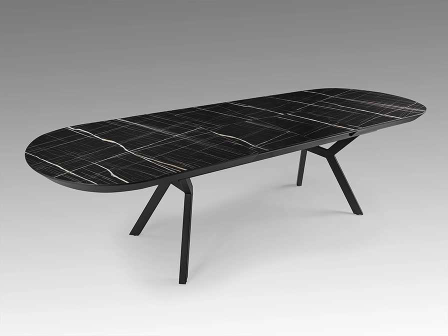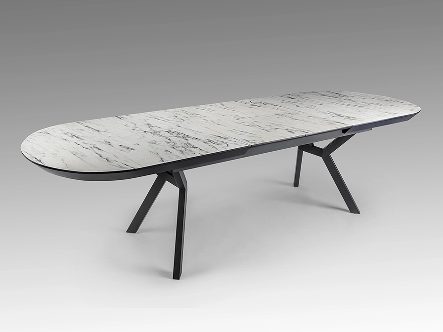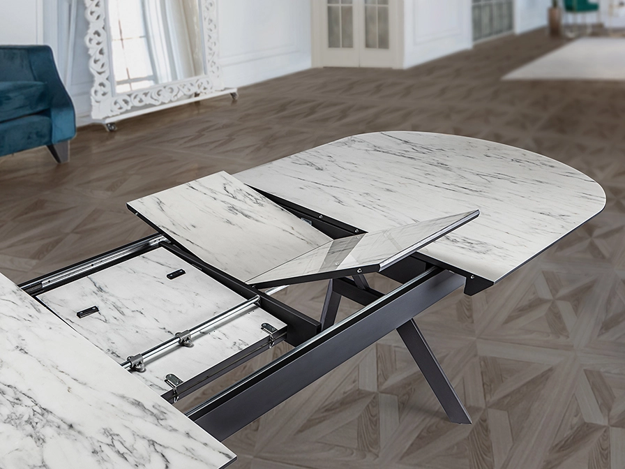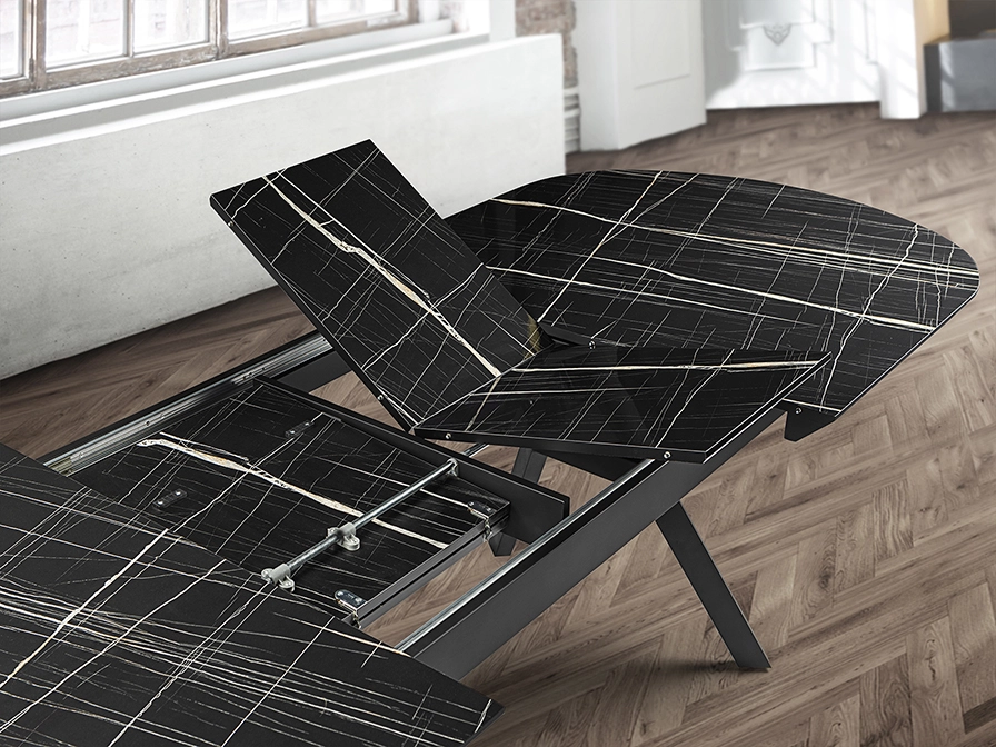 Mesa de jantar extensível, realizada em metal, acabamento preto mate e tampo de melamina de alta resistência, acabamento mármore branco ou preto brilho, com cantos em preto mate.