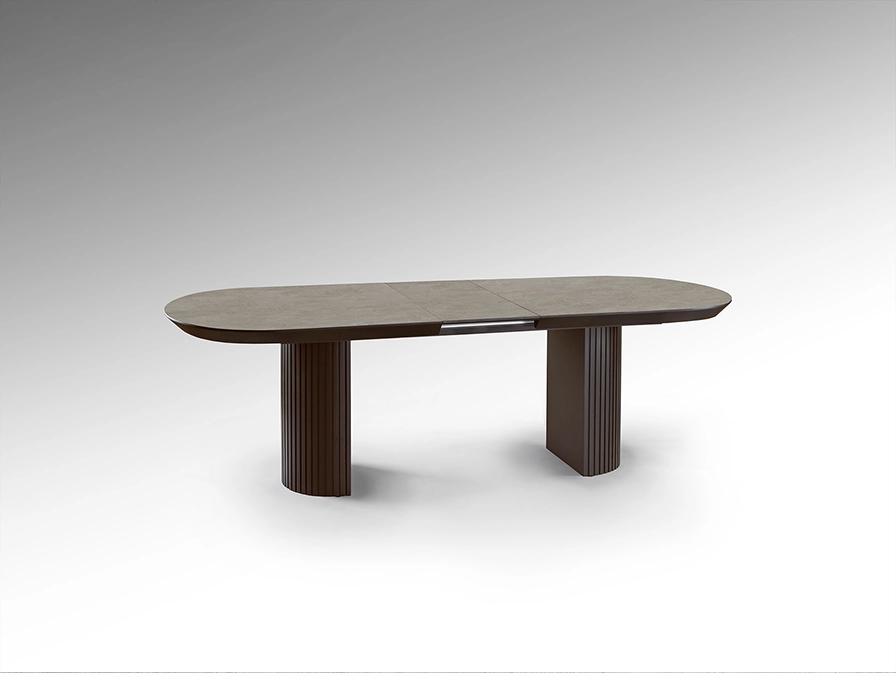 Mesa de jantar extensível, com tampo em melamina de alta resistência, acabamento pedra mate. Pés canelados em castanho e MDF.