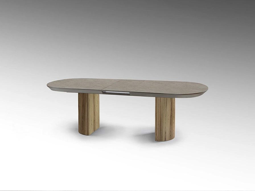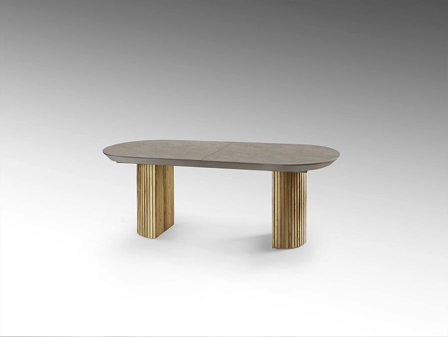 Mesa de jantar extensível, com tampo em melamina de alta resistência, acabamento pedra mate. Pés canelados em madeira e MDF.