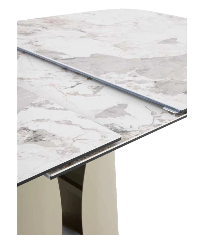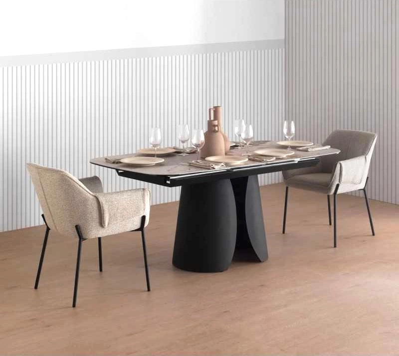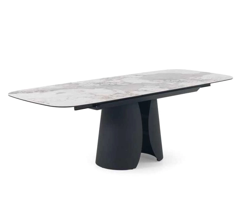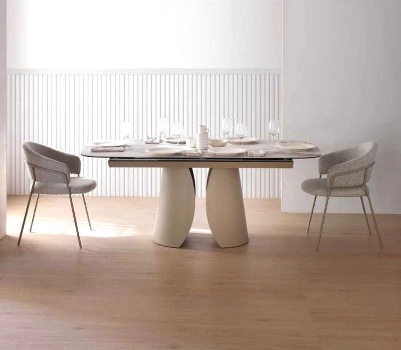 Mesa Oásis extensível com formato retangular com cantos arredondados.