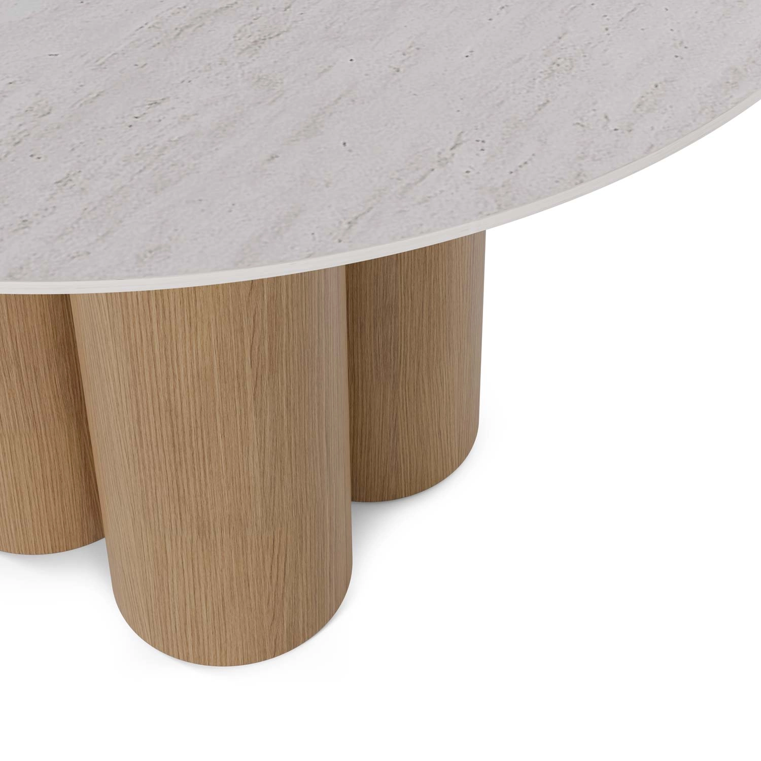 Tampo redondo em porcelanato com efeito travertino, com 120 cm de diâmetro e 11 mm de espessura.