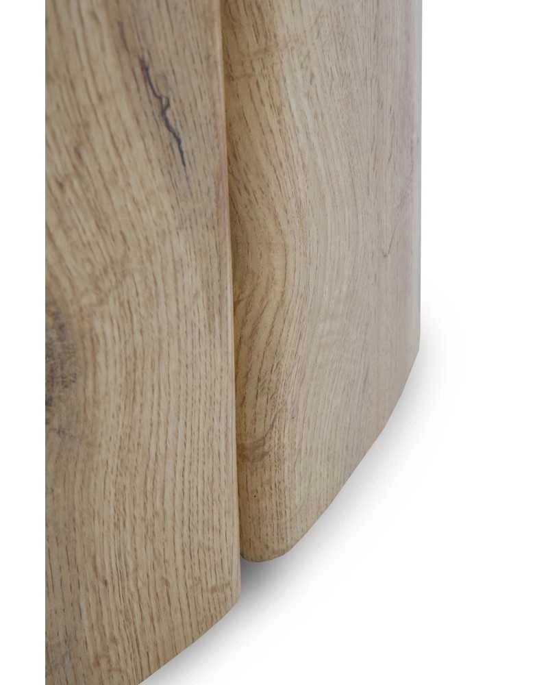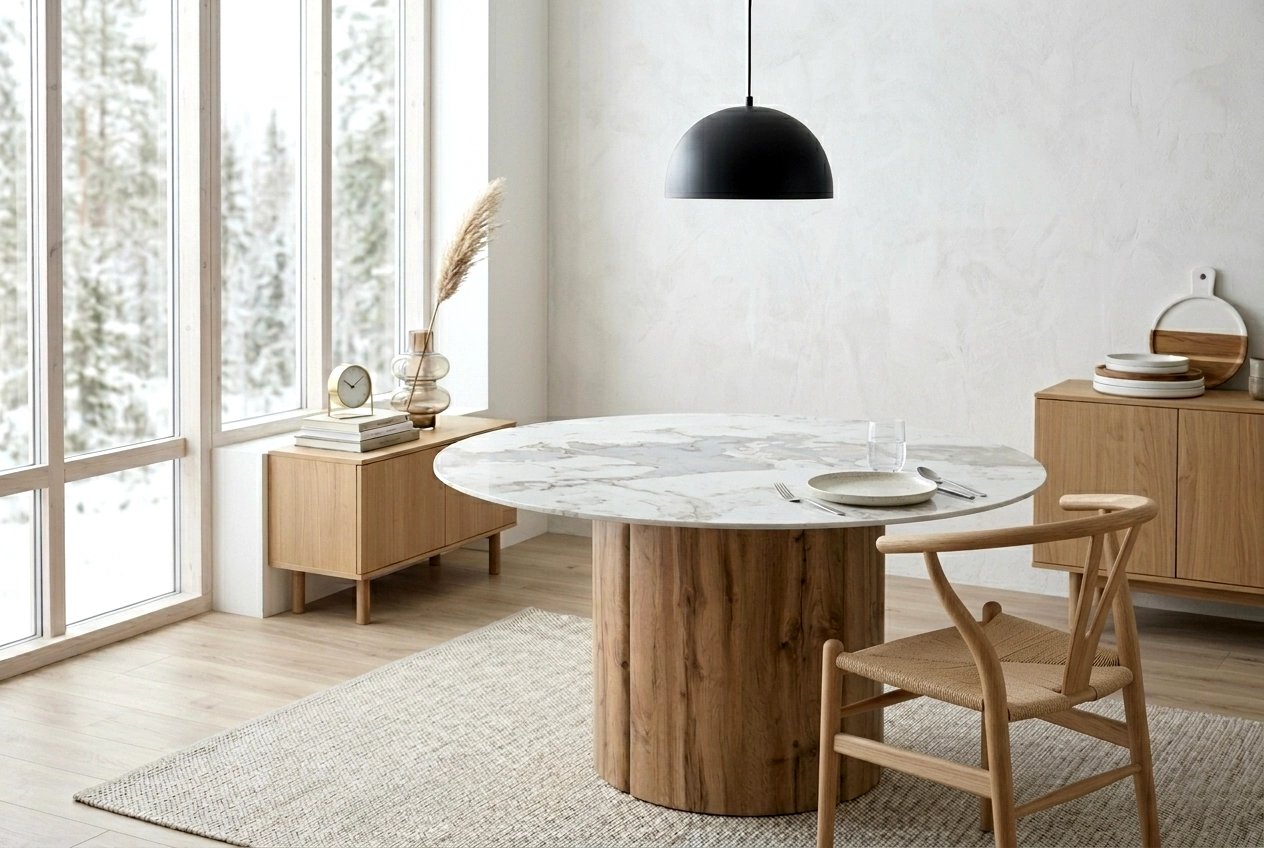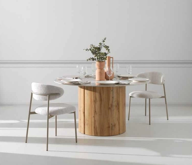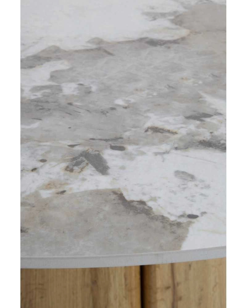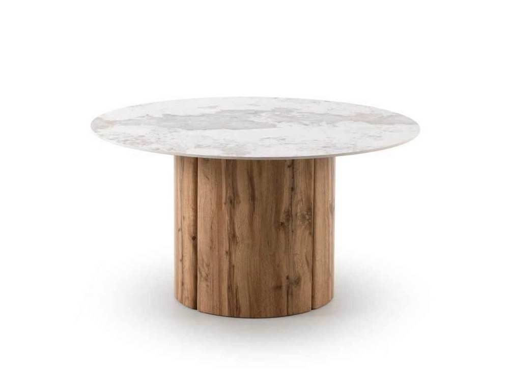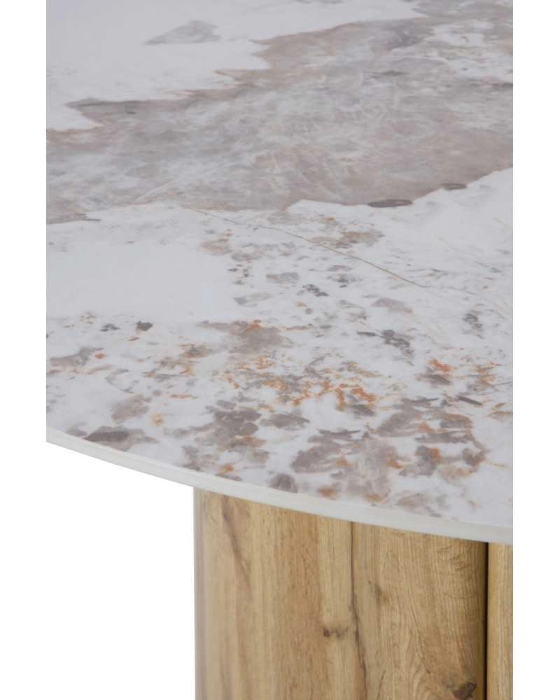 Mesa de jantar Viltra redonda com pé em MDF Carvalho e tampo em mármore cerâmica Calacatta.