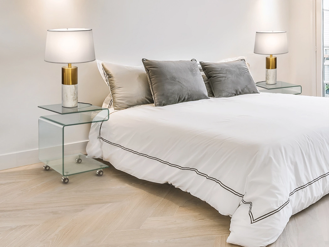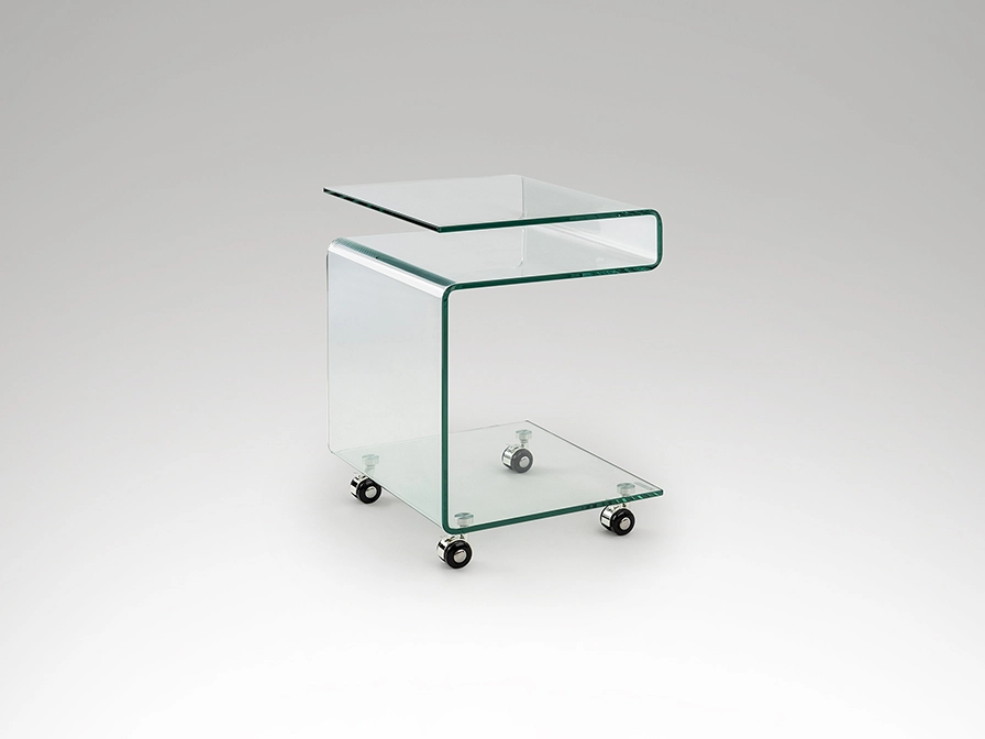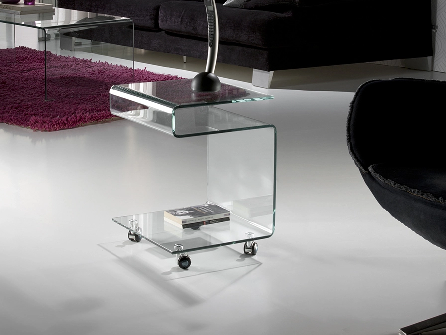 Mesa de apoio com rodas realizada em vidro curvado de 10 mm, transparente.