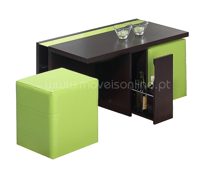 Gaveta lateral mini-bar, dois puffs quadrados e tampo comfaixa de vidro lacado.Este produto não requer montagem. Instruções de manutenção:Limpar com um pano seco.Para manchas, utilizar um pano húmidoe de seguida passar um pano seco.