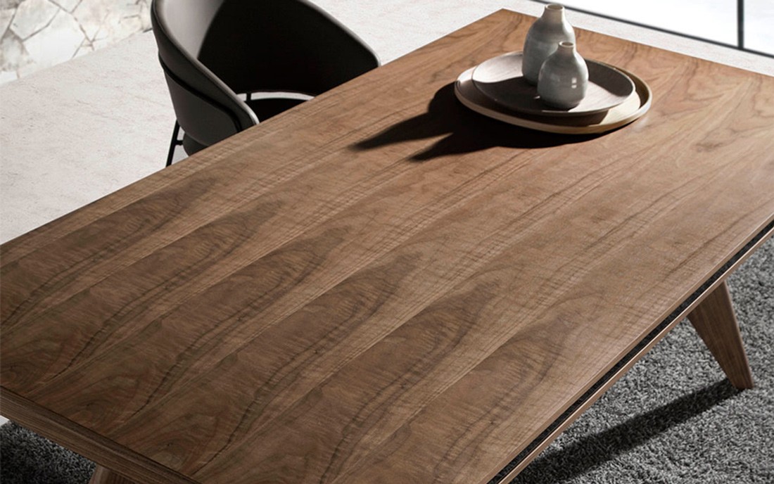 A mesa de jantar Imola possui uma base retangular fixa, tampo