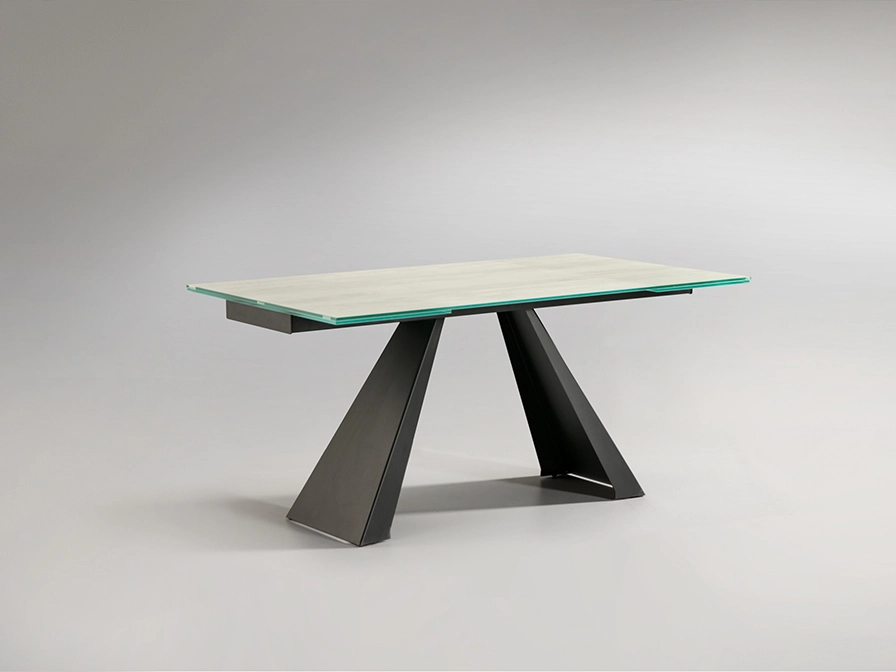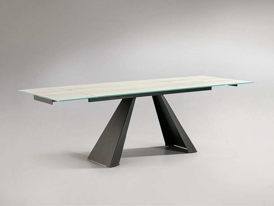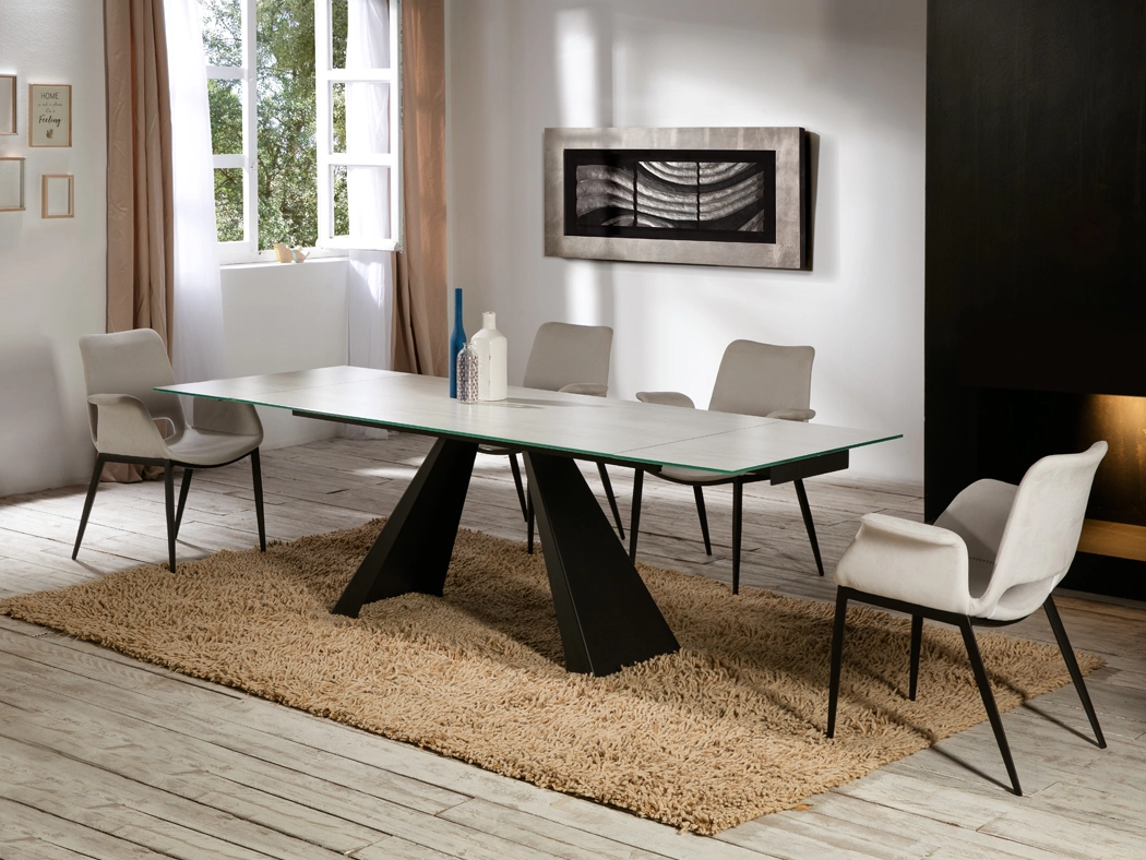 Mesa de jantar extensível, realizada em metal com acabamento preto mate e tampo de vidro temperado de 10 mm, impressa com textura branca com veios e acabamento de alta resistência.