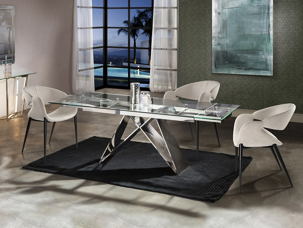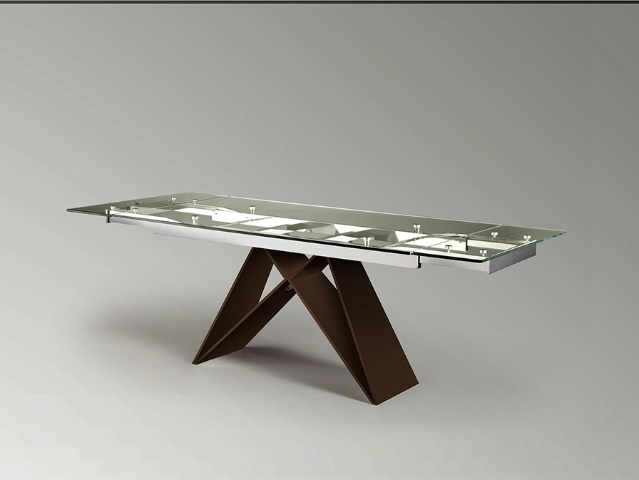 Mesa de sala de jantar extensível, realizada em aço inoxidável , acabamento alto brilho ou base em castanho óxido escuro.