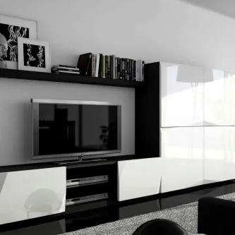 Estante 02 On em madeira e lacado preto com televisão e prateleiras decorativas