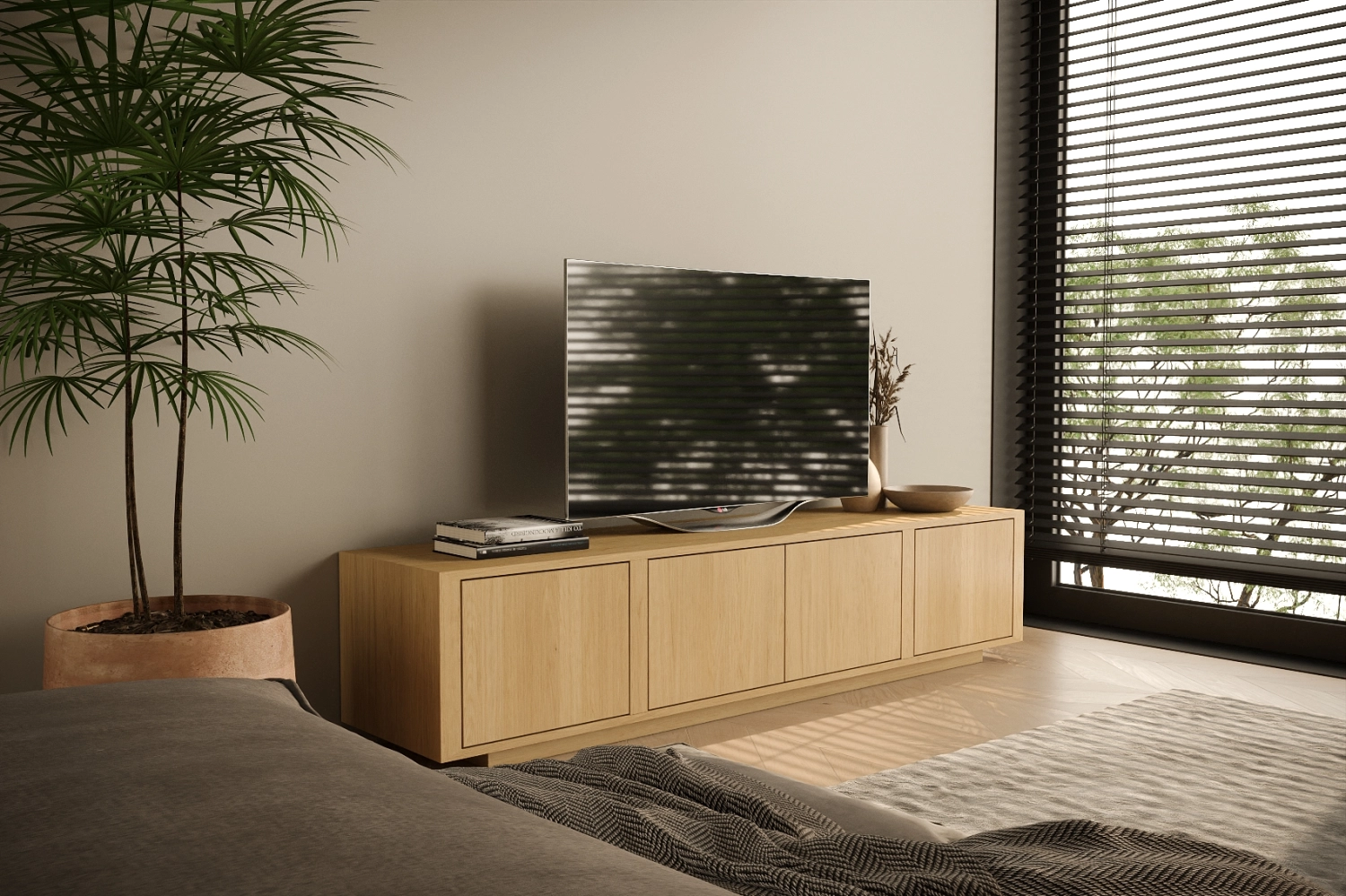 Móvel TV Dual fabricado em folha de madeira natural ou MDF Lacado.