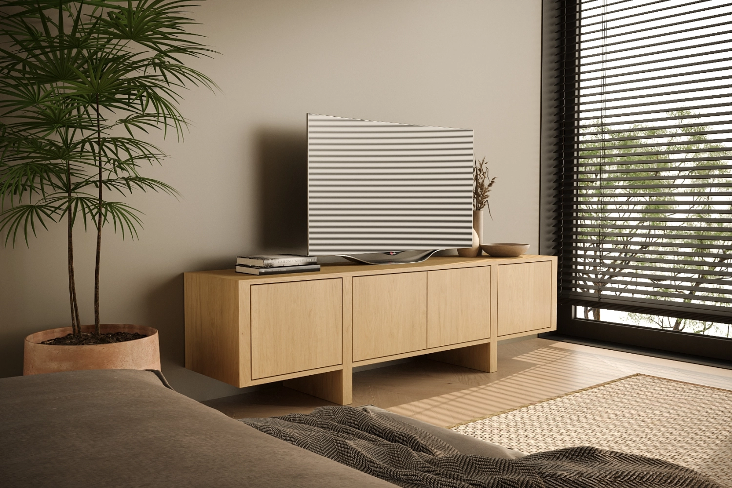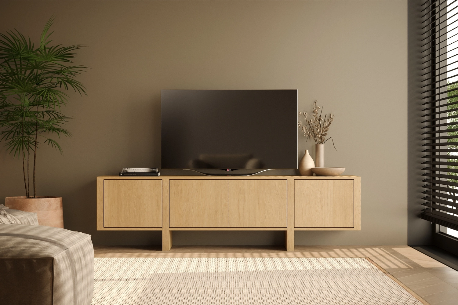 Móvel TV Dual com pés fabricado em folha de madeira natural ou MDF Lacado.