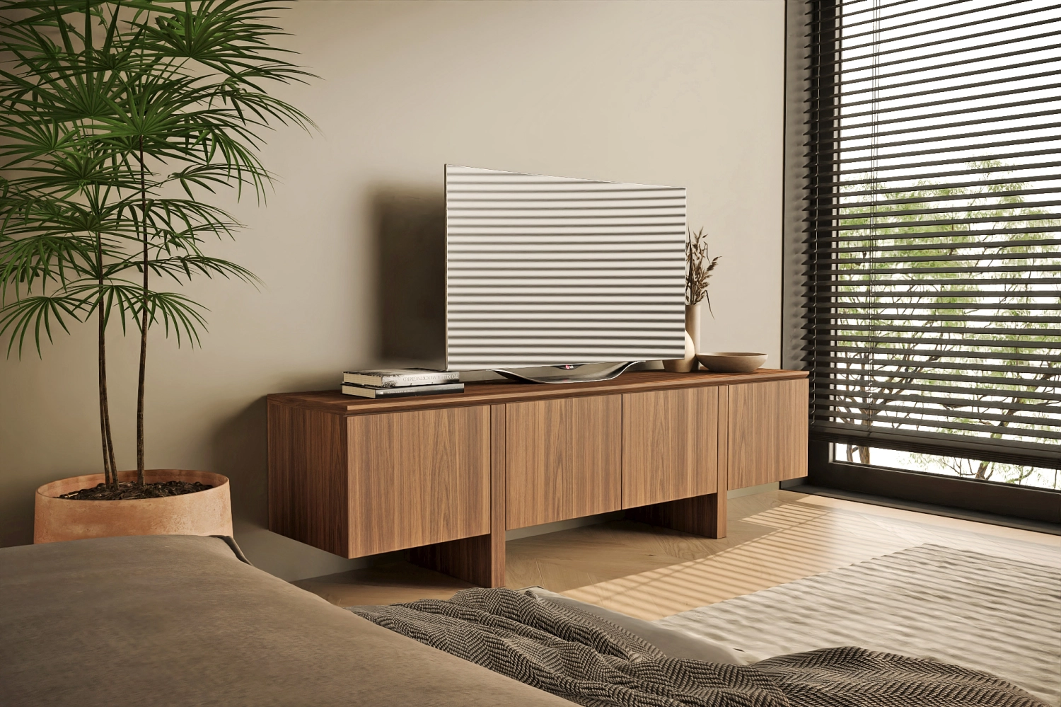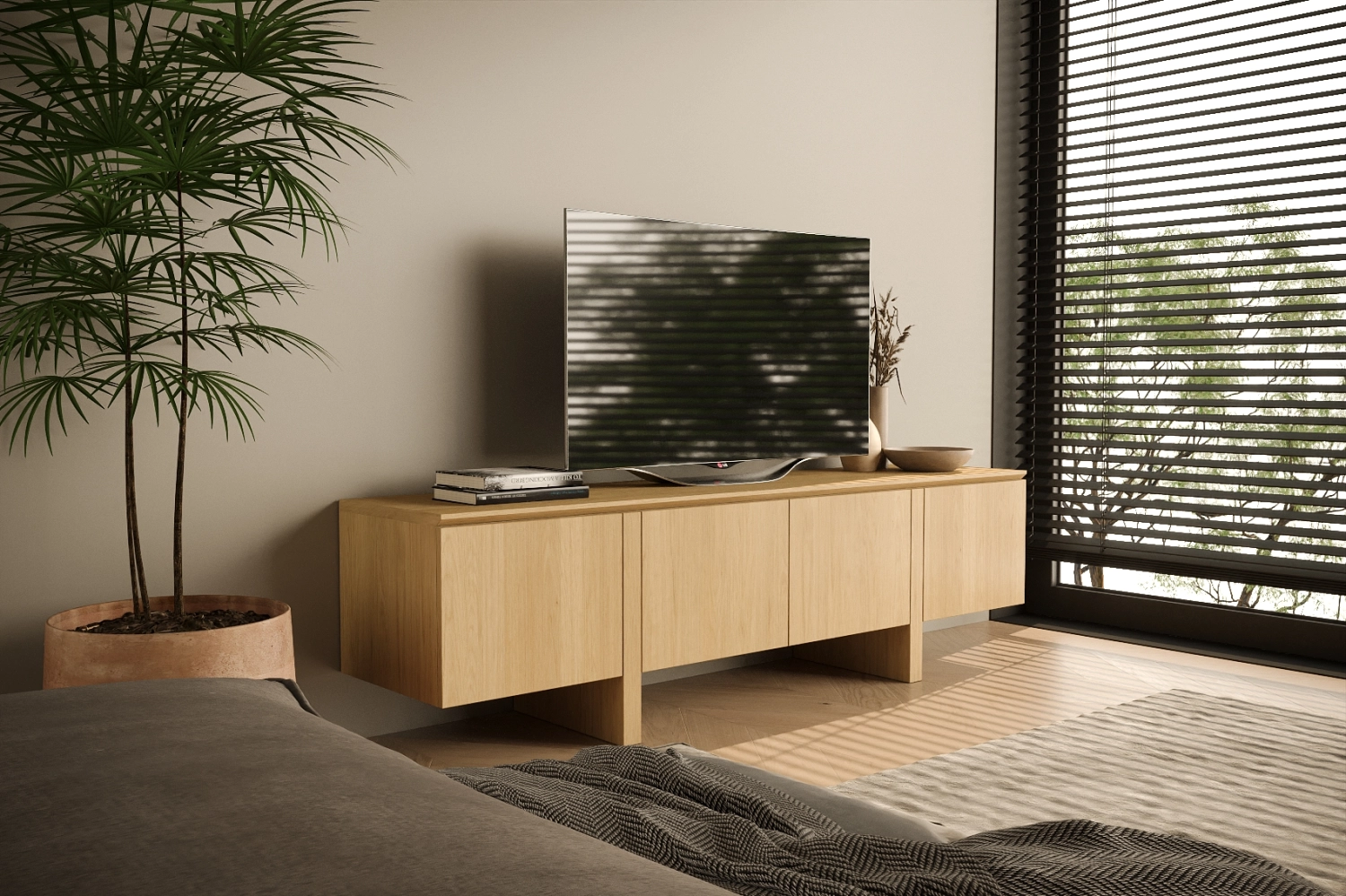 Móvel TV Dual New com pés fabricado em folha de madeira natural ou MDF Lacado.