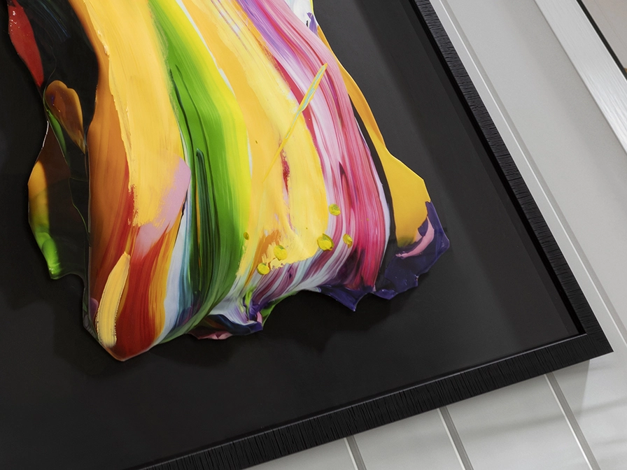 Pintura acrílica realizada em papel sobre base de DM. Moldura de poliestireno preto com lâmina de plexiglass.