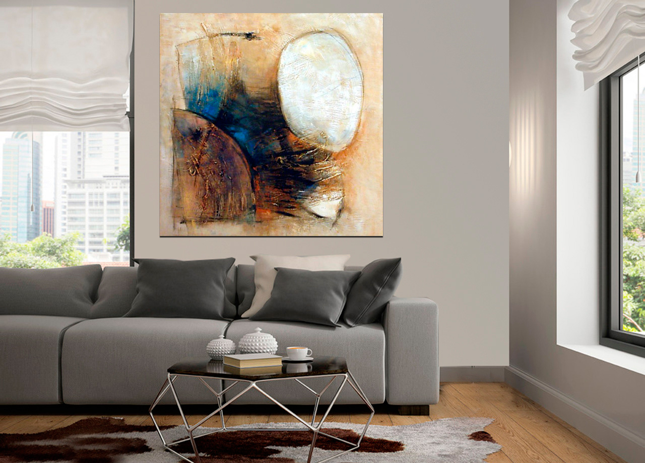 Pintura abstrata pintada à mão a óleo sobre tela, em moldura de 3 centímetros de espessura e com bordas laterais pintadas, para que a pintura esteja acabada e pronta para pendurar. Pelos seus relevos e texturas, conferem-lhe um aspecto moderno e vanguardista . Pintura pintada à mão expressamente para si, pelo que necessita de um tempo de secagem para a entregar de forma adequada.