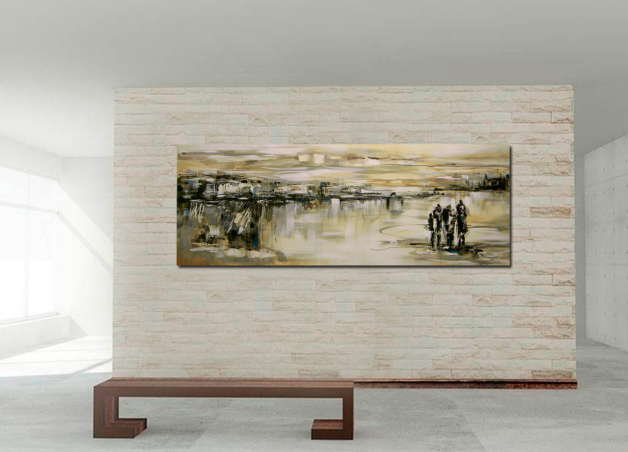 Pintura abstrata, impressos em lona e retocado à mão, imagem de um semi abstracção com uma cidade no fundo com figuras em primeiro plano, esta pintura é impresso em lona e a arte dá alguns toques de pintura em áreas relevantes da pintura, recebe esticado em uma moldura de madeira de 3 cm de espessura, a imagem continua nas bordas, de forma que nenhum enquadramento é necessário.