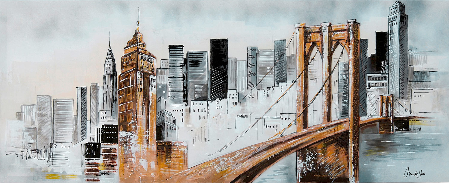 Pintura New York pintada à mão, visto a partir do distrito de Brooklyn para a área financeira da Wall Street, onde a ponte de Brooklyn icónica é a ligação natural entre estes dois distritos de Nova York. Esta pintura transmite toda a essência da atraente cidade de arranha-céus, este pintura é projetado para pendurar sobre as principais paredes de sua casa . Nós pintar esta pintura na lona esticada sobre uma moldura de madeira 3 cm de espessura, as bordas são pintados para combinar, você recebe-lo pronto para desligar.