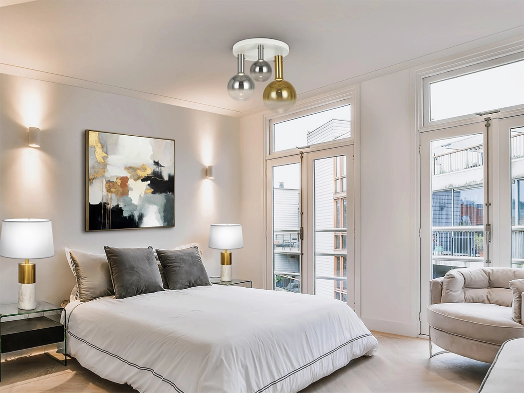 Plafon realizado em metal, acabamento branco mate. Abajures de vidro soprado de Ø15, 20 e 25 cm, cinzento smoke espelhado e dourado espelhado.