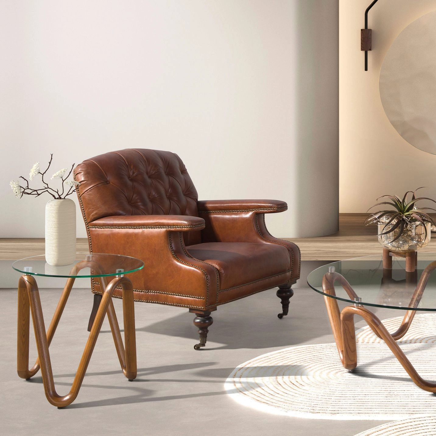 Assento e encosto estofados em pele natural castanha cognac.