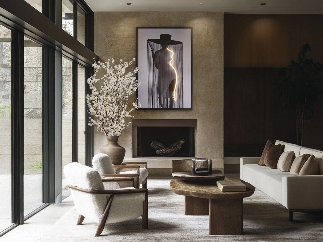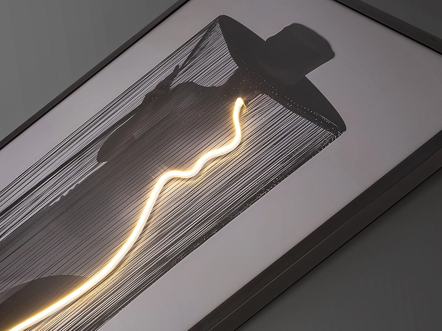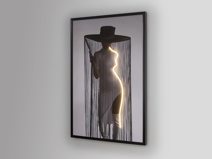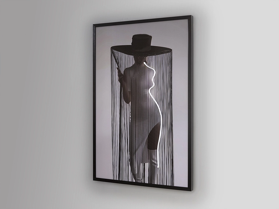 Figura de mulher com chapéu de aba larga, composição com fita de luz Led decorativa. Tela impressa, colada sobre placa e emoldurada a preto.