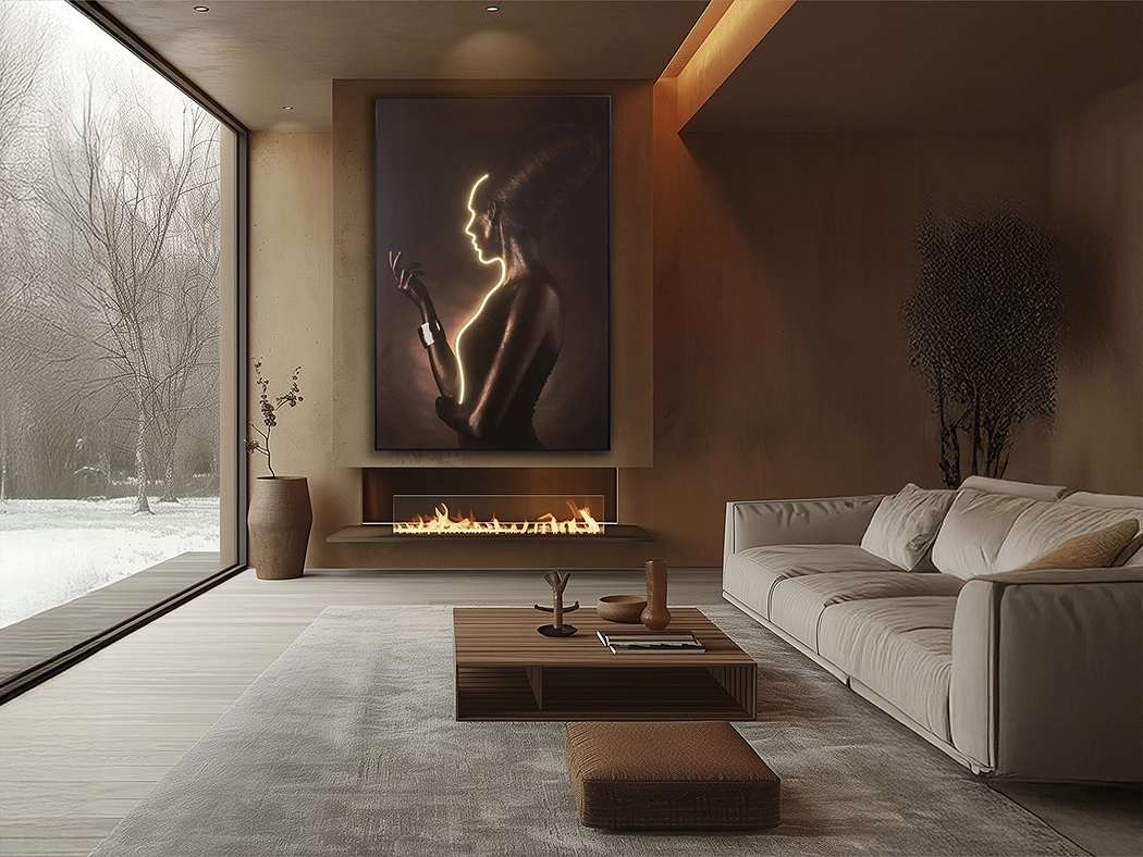 Este quadro luz silueta transforma a sua sala de estar num refúgio de elegância e conforto. A figura destacada por uma iluminação integrada cria um ponto focal envolvente que atrai olhares e define o ambiente com sofisticação. Ideal para quem procura uma peça decorativa que une arte e iluminação, este quadro realça texturas e tons da divisão sem competir com o restante mobiliário. A luz suave acentua a profundidade da imagem e adiciona uma atmosfera acolhedora nas horas de descanso ou receção de visitas. Perfeito para configurações contemporâneas ou minimalistas, a peça funciona como elemento de destaque que valoriza a sua decoração existente e oferece uma nova leitura do espaço. Disponível numa variedade de acabamentos para combinar com diferentes estilos e preferências, o quadro é uma solução multifuncional que une estética e funcionalidade. Escolha esta peça para criar um ambiente mais intimista e sofisticado na sua sala de estar e aproveite uma obra que se integra com facilidade e impacto visual.