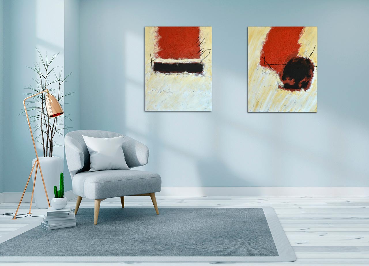 Pinturas ideal para combinar ao criar ambientes modernos e atuais, com um simples e estilo elegante, com um toque de cor que, juntamente com as texturas e combinação cromática, transforma estas pinturas em autêntica pintada à mão obras de arte expressamente para você . Nós pintamos essas pinturas à mão em tela de linho com bastidor de 3 cm de espessura. Bordas pintadas para que não seja preciso moldura. Pronto para pendurar.