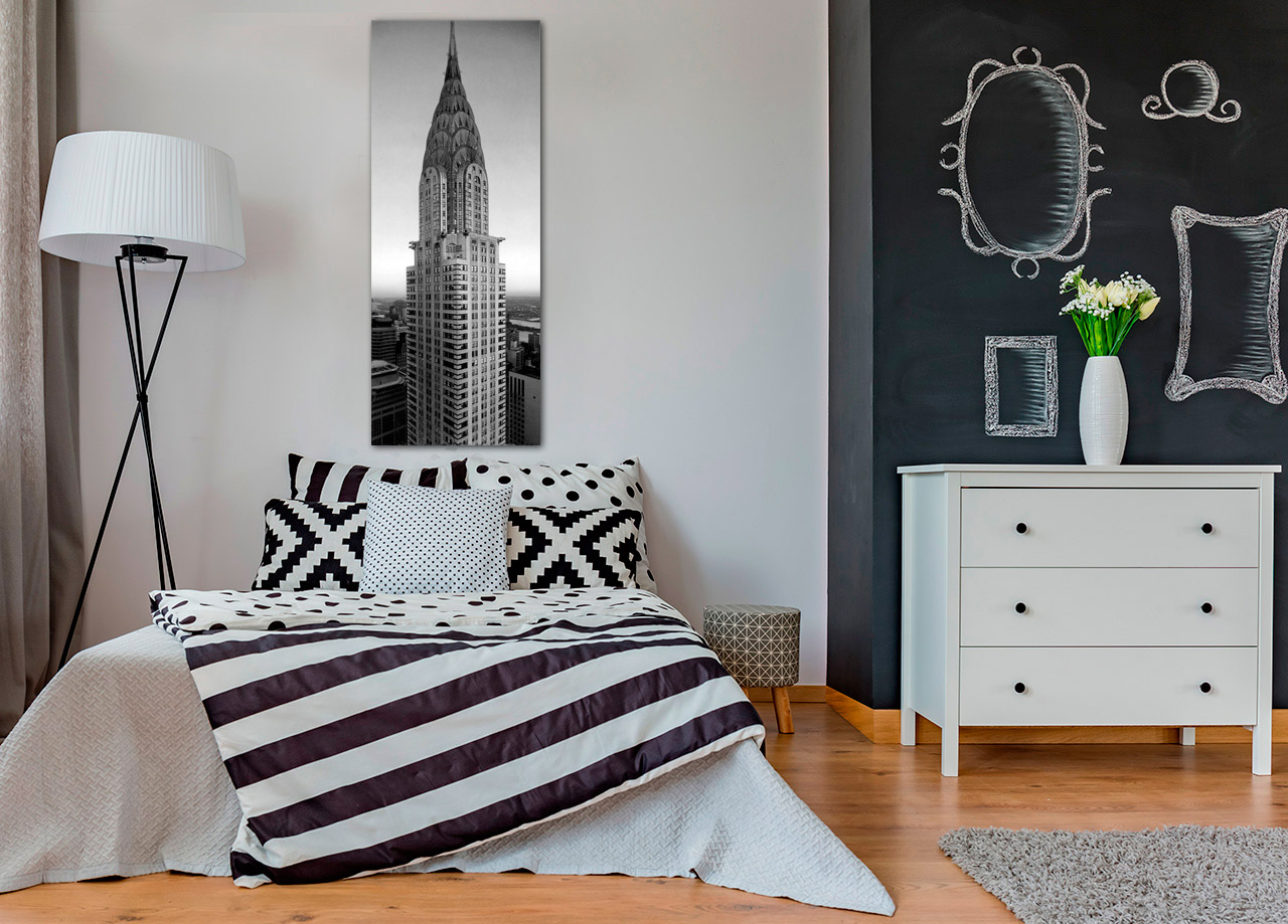 Este quadro edifício chrysler traz um toque urbano e contemporâneo à decoração, com imagem icónica em preto e branco que valoriza qualquer parede. Ideal para quem procura quadros cidades que criem impacto sem sobrecarregar o ambiente, oferece um ponto focal elegante para quarto ou sala. A composição vertical realça a sensação de altura e dá ritmo ao espaço, enquanto a tonalidade sóbria facilita a combinação com diferentes estilos e cores. Perfeito para realçar uma parede vazia e conferir uma atmosfera cosmopolita e sofisticada ao seu lar.
