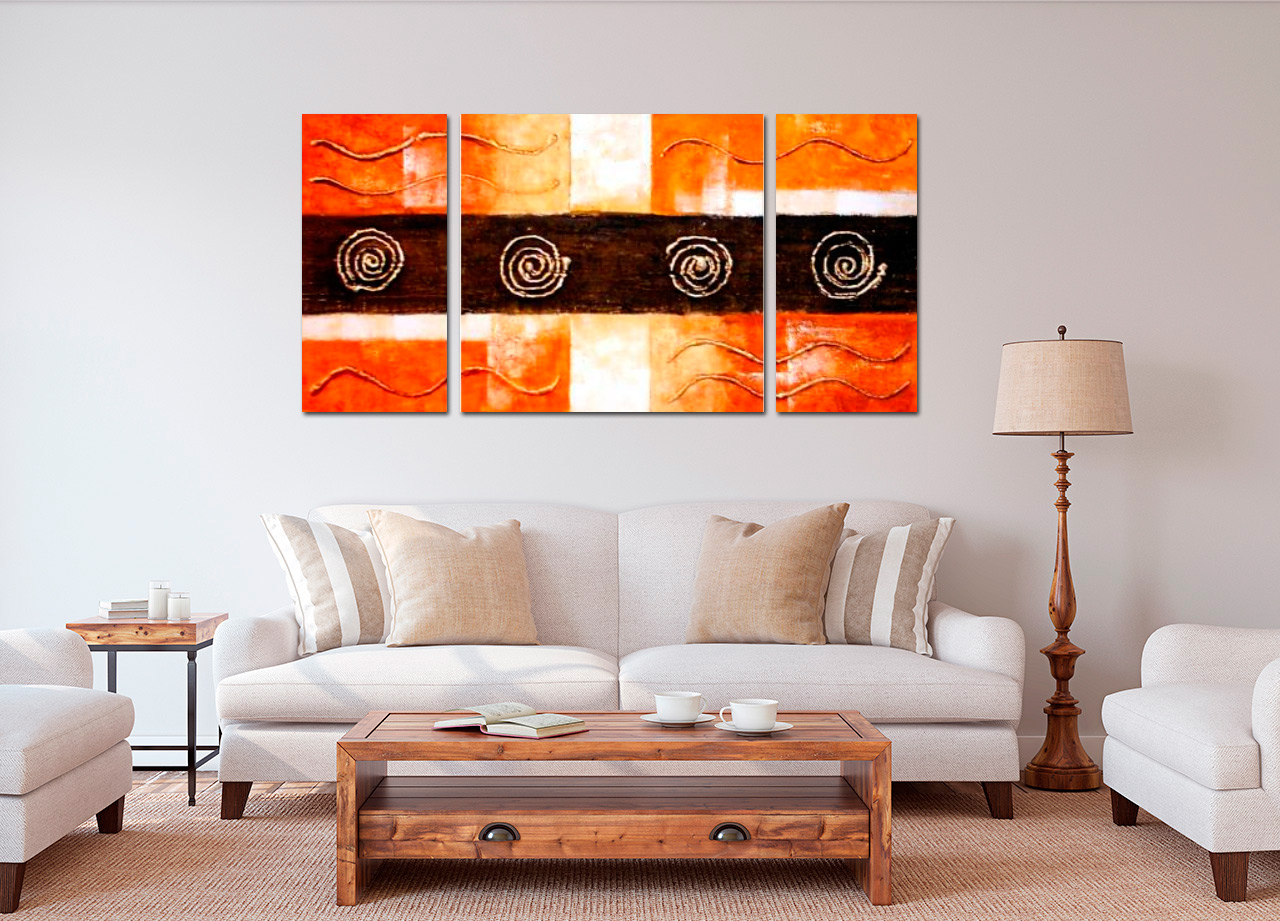 Este quadro faixas laranja da categoria quadros abstratos é composto por quatro painéis que formam um conjunto vibrante. As faixas em laranja e preto com toques claros e motivos espirais criam um ponto focal que aquece e dinamiza a sala de estar. Ideal para complementar móveis neutros, acrescenta profundidade e equilíbrio visual sem dominar o espaço. Uma peça versátil que transforma paredes simples em cenários modernos e acolhedores. Perfeito para quem procura uma solução de decoração contemporânea com impacto imediato e personalidade.