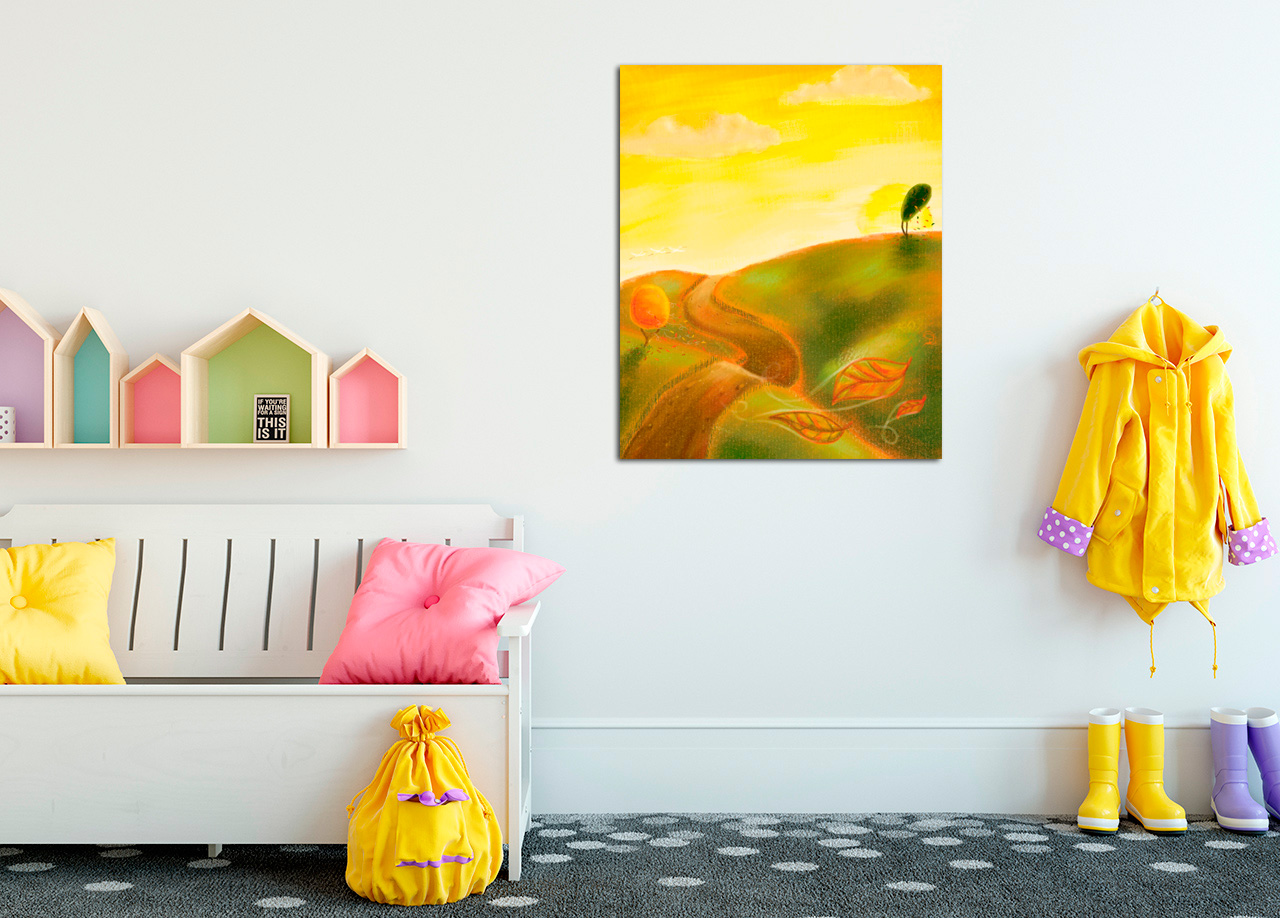 Este quadro infantil outono traz um cenário suave de colinas e folhas em tons quentes que transformam o quarto numa atmosfera acolhedora e serena. As cores amarelo e laranja estimulam a criatividade e oferecem conforto visual, perfeito para momentos de leitura e brincadeira. Ideal para quartos juvenis e para quem procura uma decoração quarto infantil com toque temático e contemporâneo, funciona como ponto focal sem sobrecarregar o ambiente. Facilita a combinação com almofadas e acessórios neutros ou coloridos, criando um espaço harmonioso e convidativo que acompanha o crescimento da criança.
