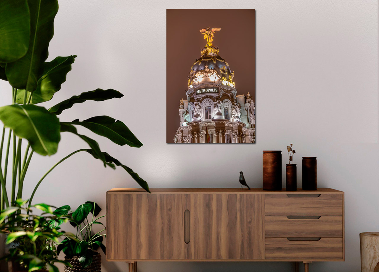 Este quadro Madrid Metropolis traz a imagem icónica do edifício Metropolis em Madrid e transforma qualquer parede num ponto de interesse urbano. As luzes douradas da cúpula criam um contraste elegante com o fundo escuro que acrescenta profundidade e sofisticação ao ambiente. Ideal para sala, escritório ou quarto, confere um toque cosmopolita sem esforço e facilita a harmonização com móveis modernos e plantas. Perfeito para quem aprecia a paisagem urbana e viagens, funciona como peça central que atrai o olhar e completa a decoração com personalidade.