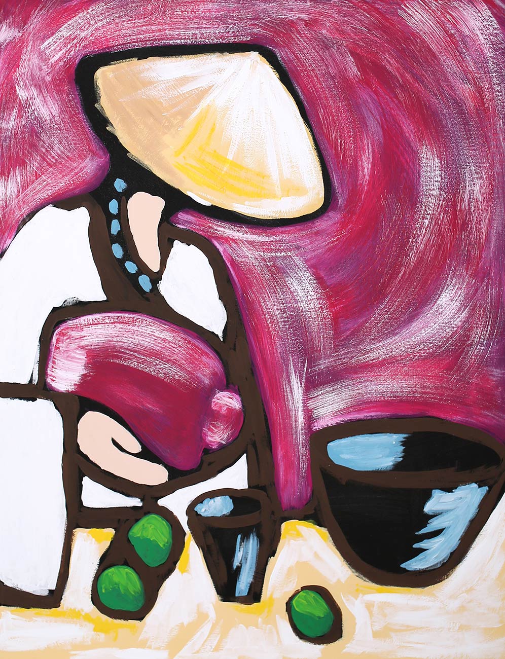 Figura oriental pintura com vaso, pintada à mão em cores quentes e agradáveis.