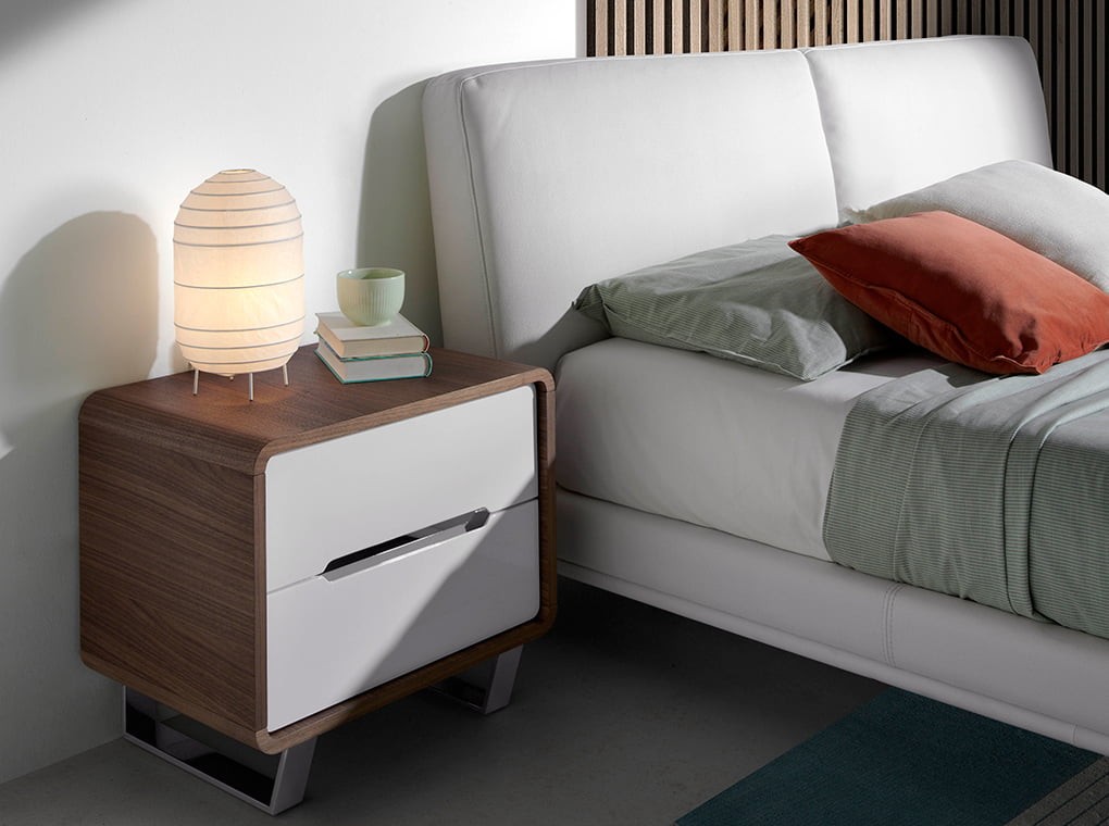 Cómoda e mesas de cabeceira folha de Nogueira com frentes lacado Branco Brilhante.