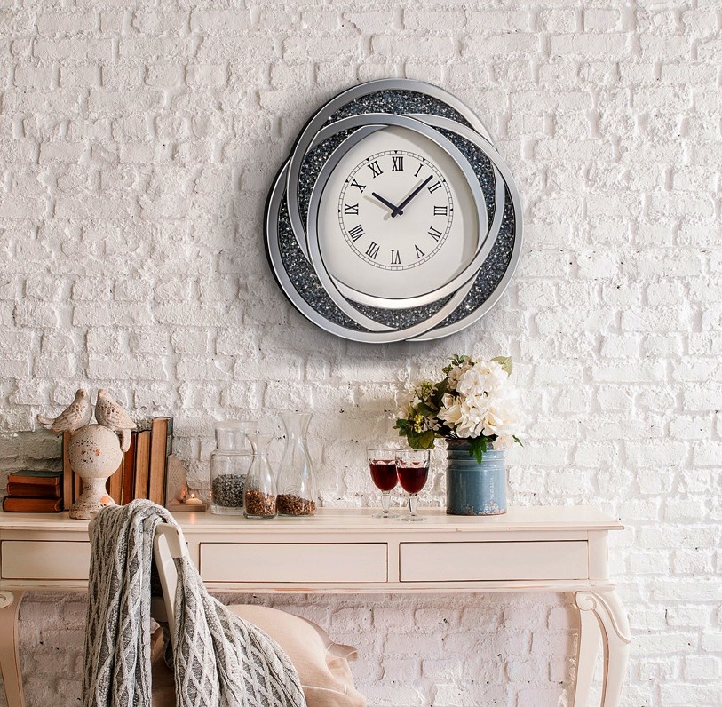 Descrição: Relógio de parede com moldura de aros entrelaçados,