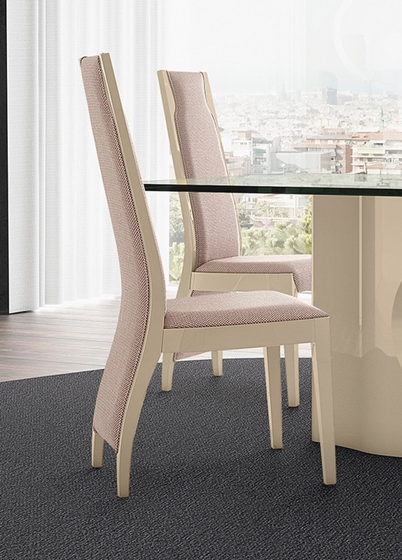 MDF e folha de madeira natural com detalhe em inox na mesa de jantar.