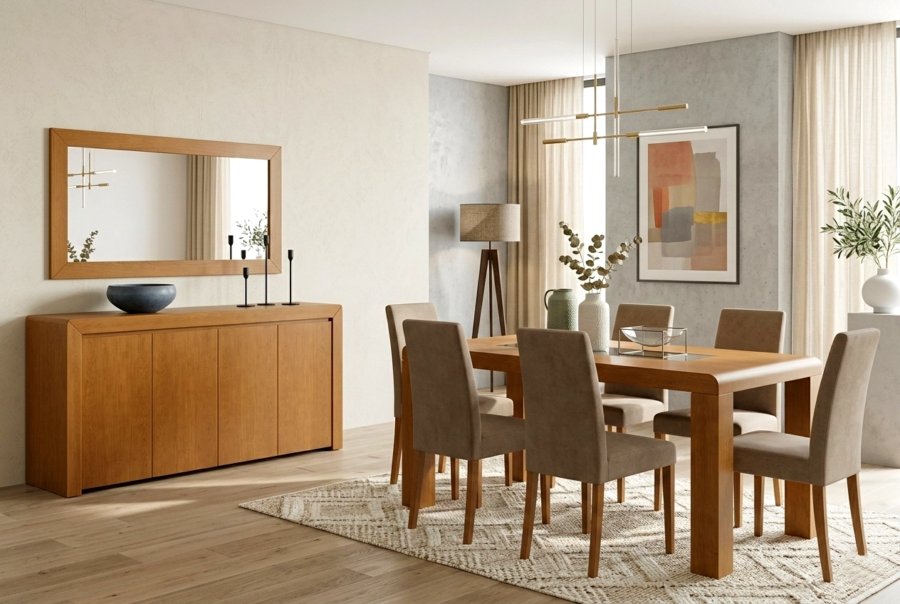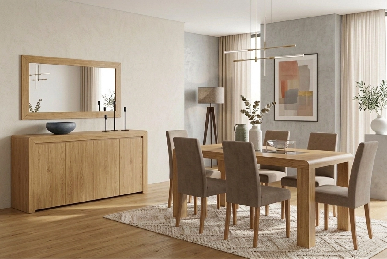 - Mesa em madeira natural com presença robusta