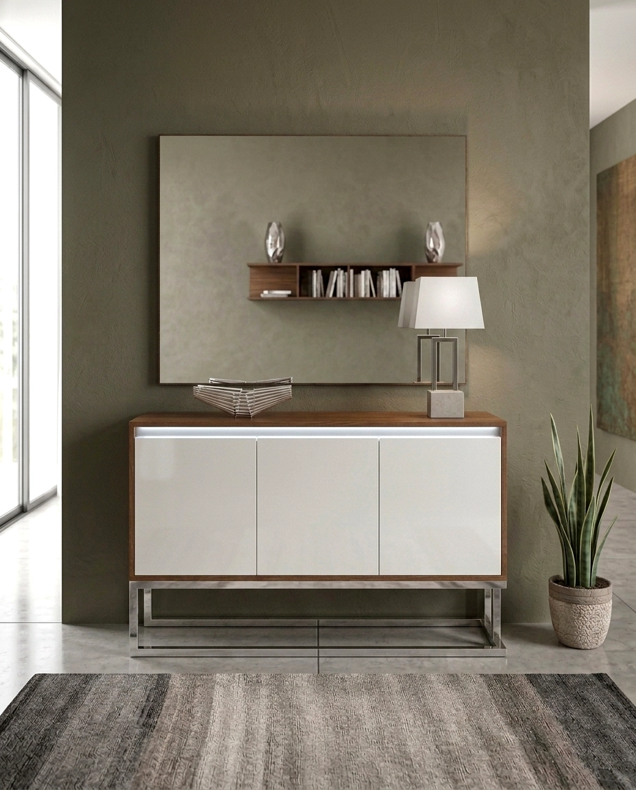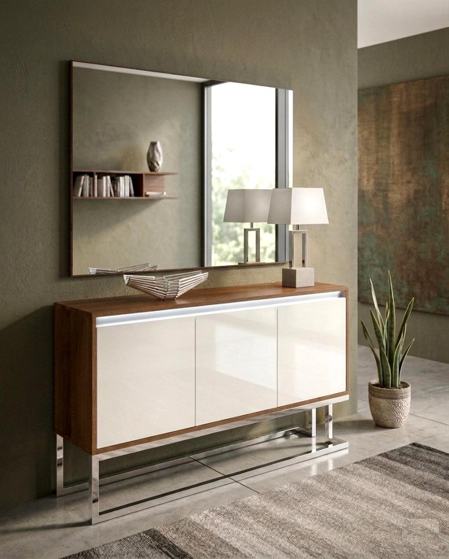 - Acabamento branco brilhante que destaca o hall