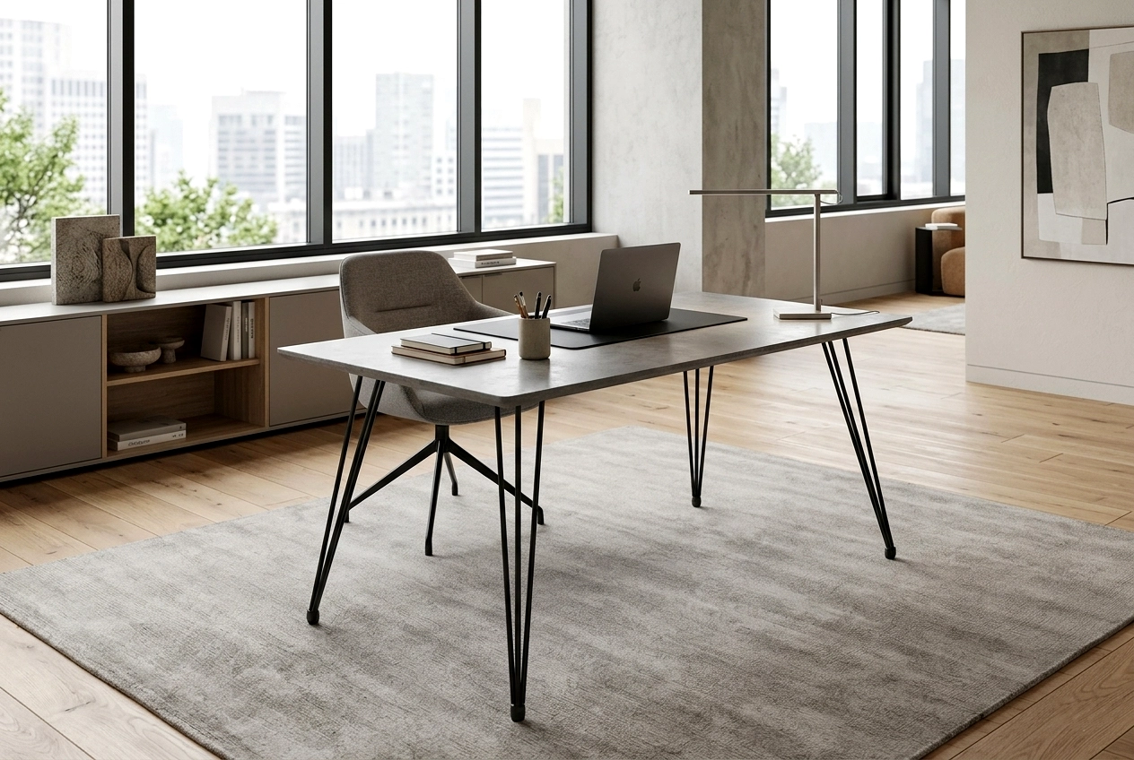 Secretária com tampo em melamina efeito cimento.