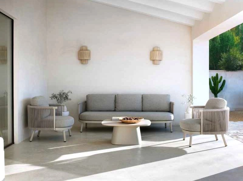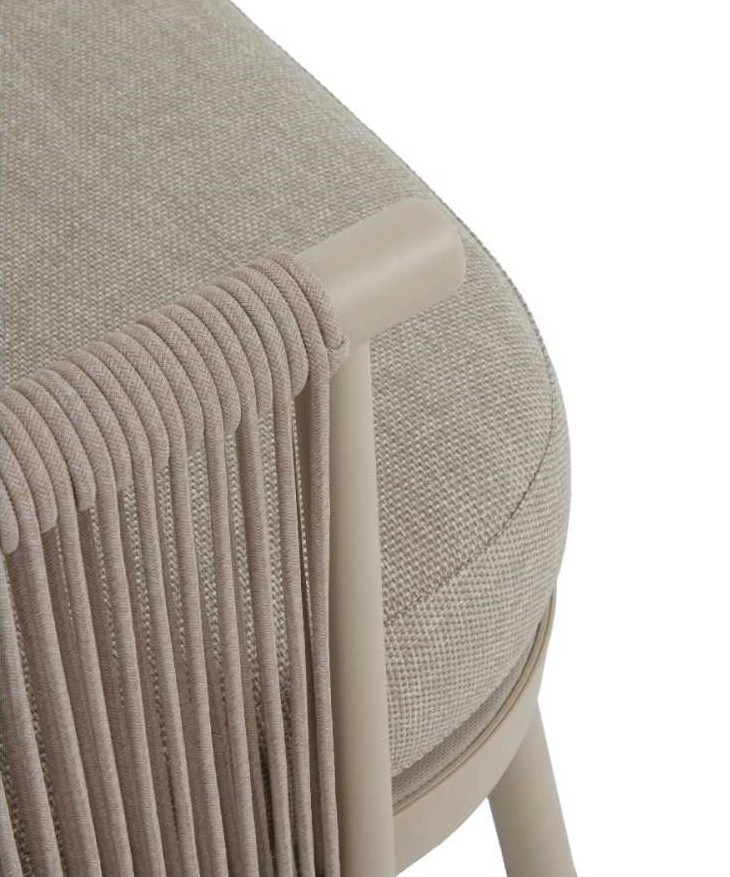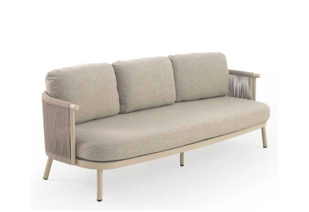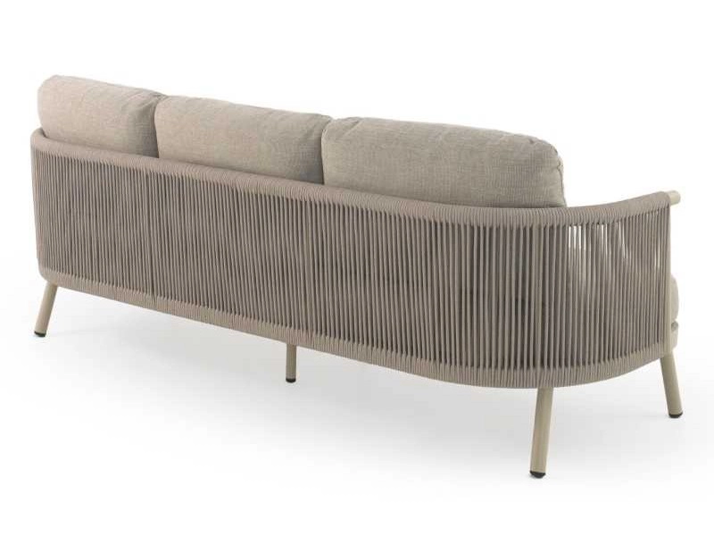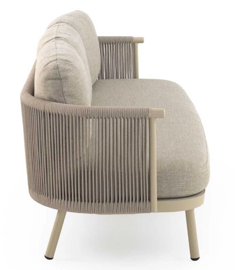 Sofá de alumínio cor areia, entrançado em corda sintética cor de areia com almofadas.
