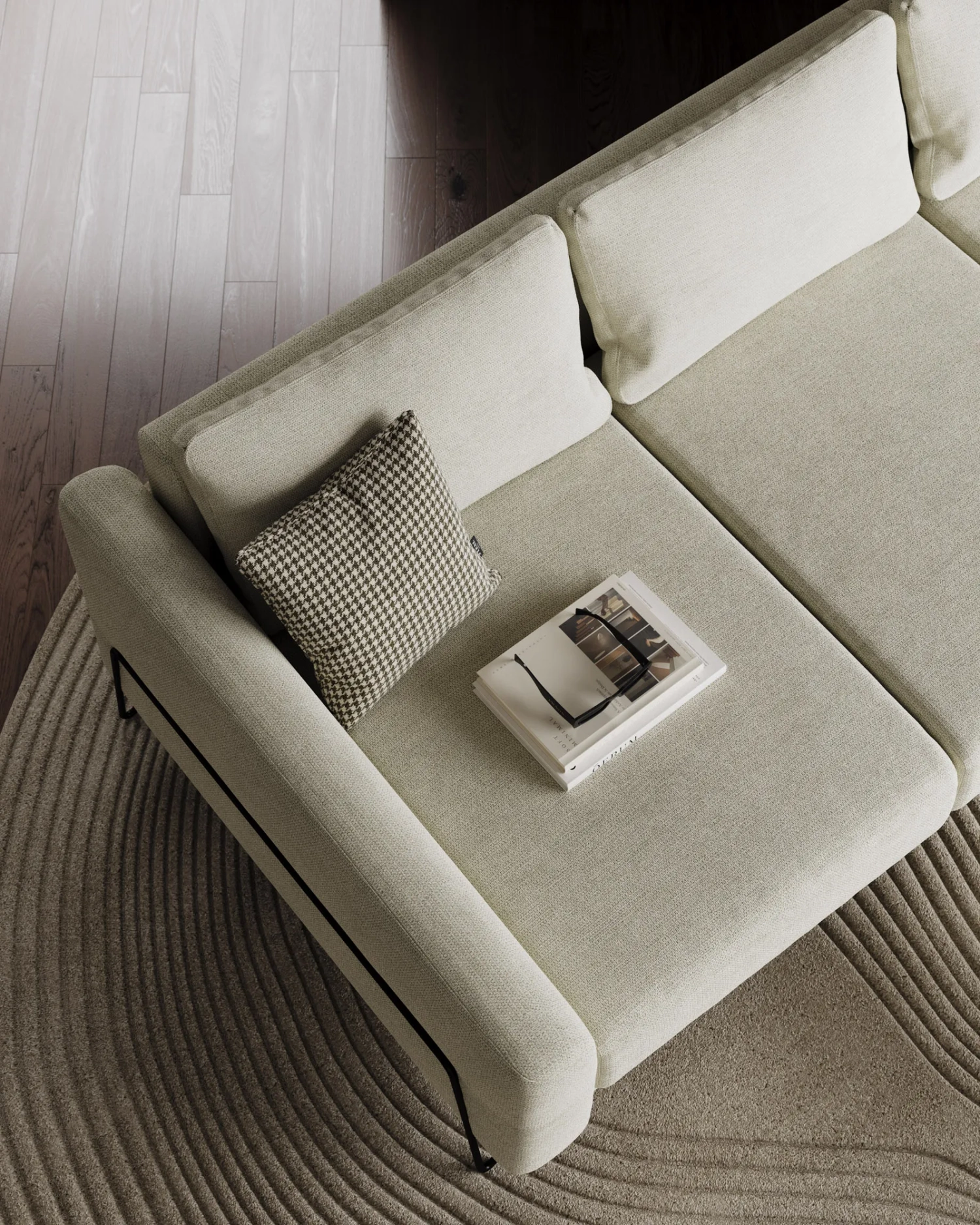 Estrutura em madeira maciça e aglomerado, com assentos em espuma poliuretano de alta resiliência HR3529.