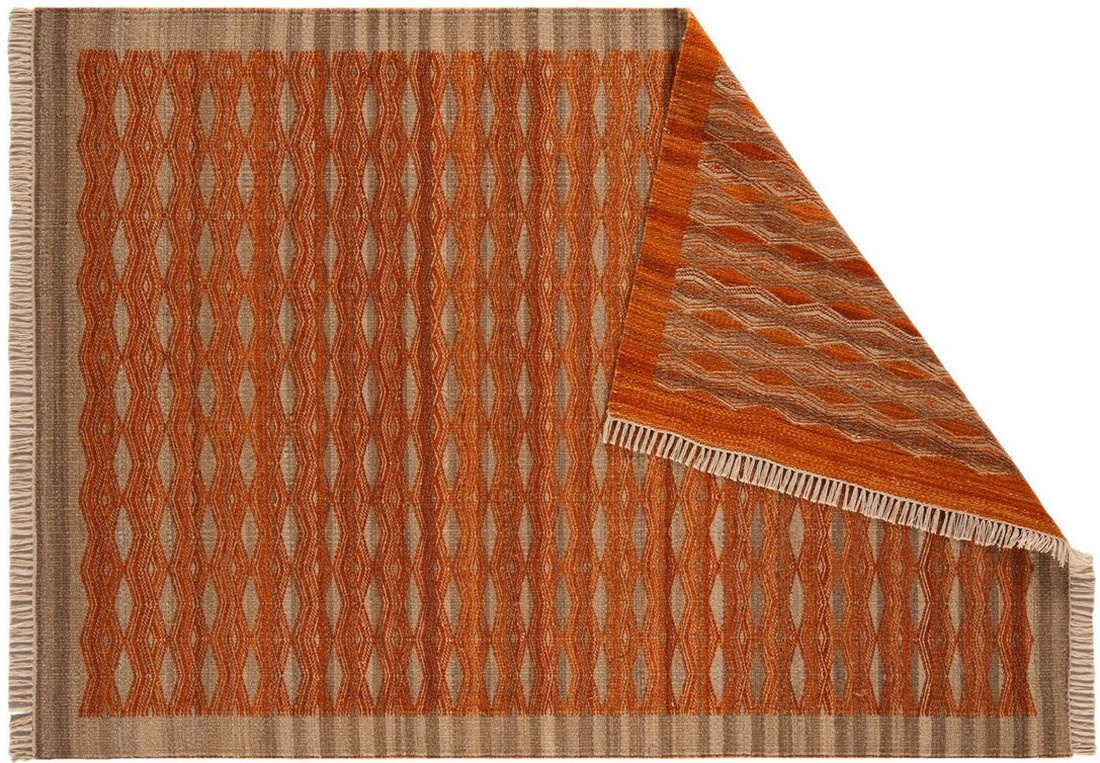 Tapete Kios traz um padrão clássico em tons quentes de laranja e bege que aquece qualquer divisão. O desenho entrelaçado cria movimento visual sem sobrecarregar o ambiente, enquanto o verso apresenta um padrão complementar que aumenta a versatilidade de uso. Perfeito para quem aprecia tapetes clássicos com personalidade. Ideal para sala, quarto ou corredor, acrescenta um toque acolhedor e sofisticado ao espaço e facilita a combinação com móveis em madeira e tecidos neutros. A franja nas extremidades realça o aspeto artesanal e confere um acabamento cuidado. Um investimento de estilo que transforma a decoração com personalidade e aconchego.