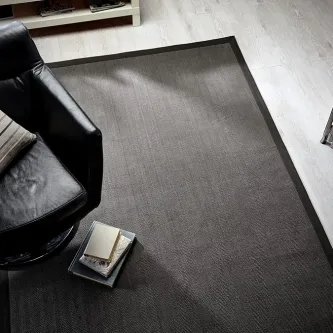 Tapete Natural Fibre retangular cinzento escuro com borda preta sobre chão claro