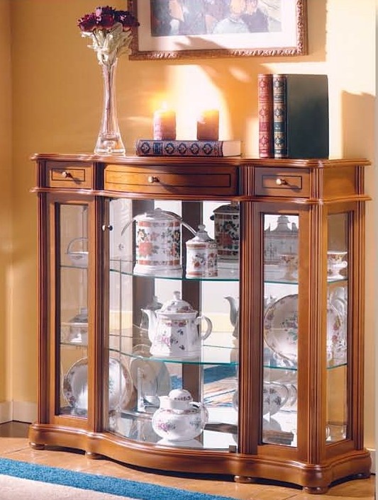 Dimensões: C 100 X L 35 X A 97 cm Materiais: Estrutura em madeira maciça de cerejeira,tampo em aglomerado folheado a cerejeira.Porta, prateleiras e laterais em vidro. Costa e fundo com espelho.Vitrine com três gavetas.