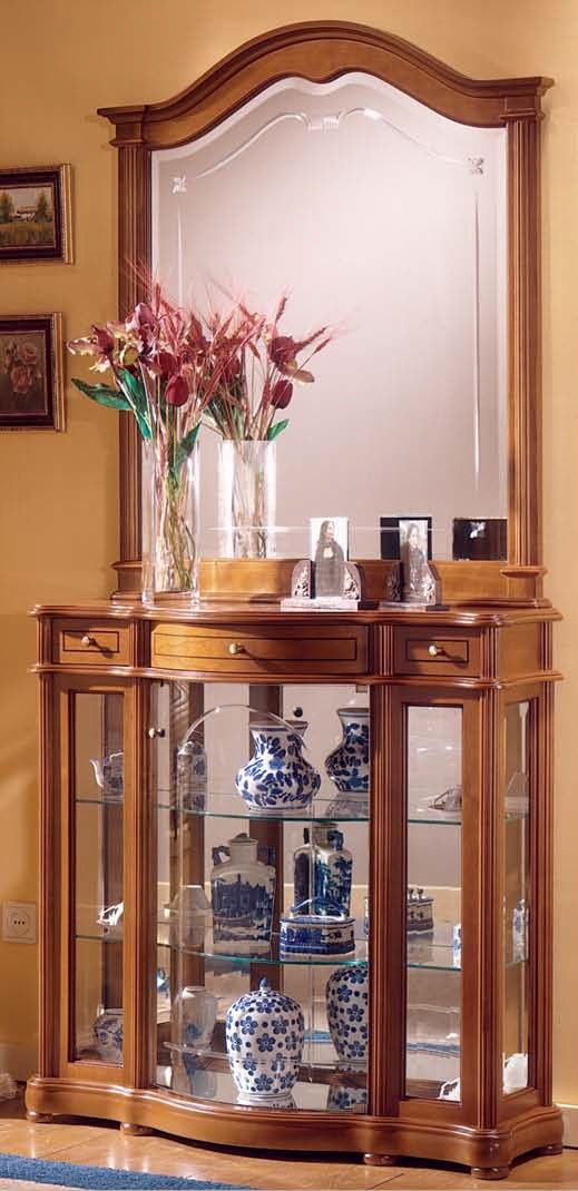 Dimensões: C 100 X L 35 X A 204 cm Materiais: Estrutura em madeira maciça de cerejeirae tampo em aglomerado, folheado a cerejeira.Porta, prateleiras e laterais em vidro. Costa e fundo com espelho.Vitrine com três gavetas e moldura com espelho.